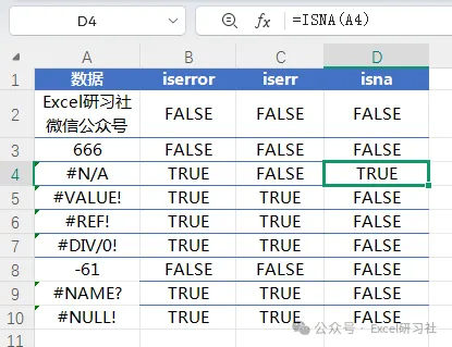 在WPS 2024中有三个错误值处理函数,分别是ISERROR所有错误都返回true、ISNA只有NA错误才返回TRUE、ISERR除了NA以外的所有错误都返回TRUE。