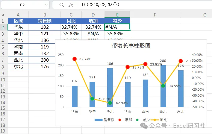 好看的图表少不了这个冷门NA函数,wps iserror、iserr和isna错误值函数用法区别,如何制作带同比增长率柱形图