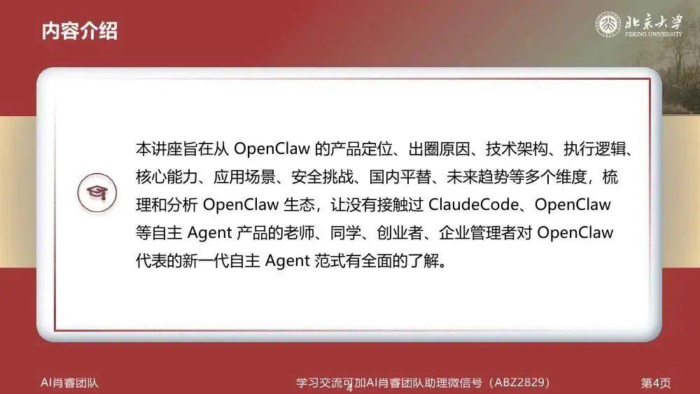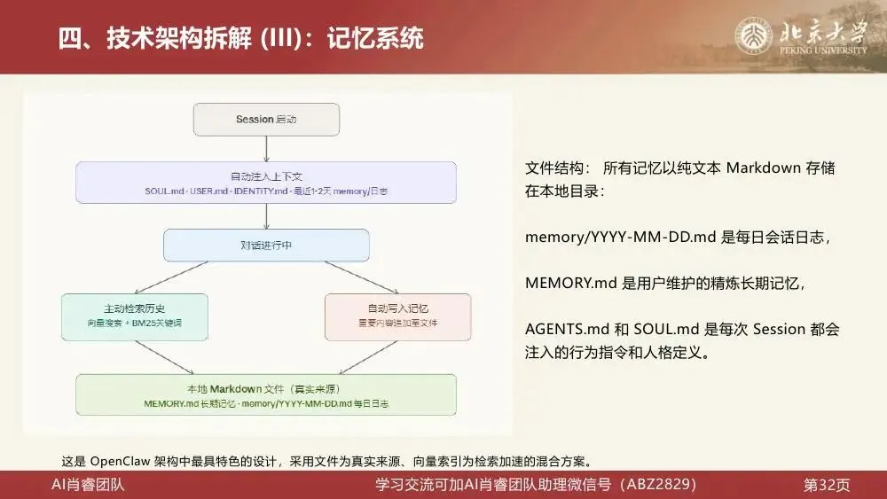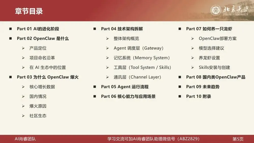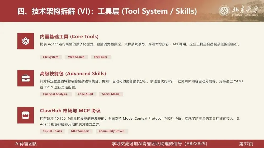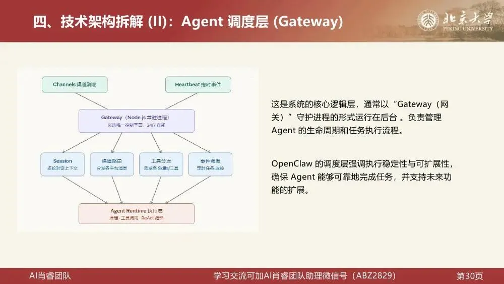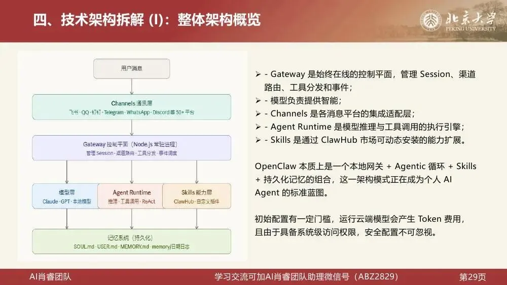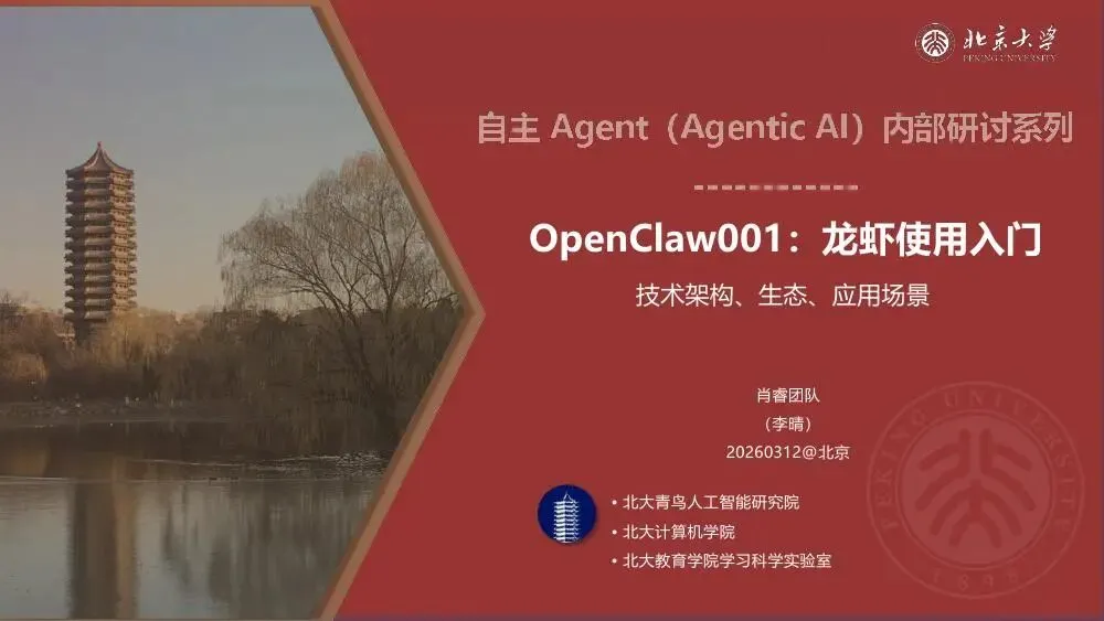北京大学《OpenClaw龙虾使用入门》| 技术架构、生态、应用场景(附完整报告下载) 北京大学《OpenClaw龙虾使用入门》| 技术架构、生态、应用场景(文末附完整报告pdf下载地址) OpenClaw是一款开源的本地优先AI Agent平台,通过网关连接飞书、钉钉等常用应用,实现始终在线的自主任务执行与工具调用。其凭借平民化部署、强大技能生态、私有化记忆和多模型支持,推动了AI从“对话交互”向“自主行动”的跨越,开启个人AI Agent平民化时代。 未完待续,请参考完整版报告 完整报告请关注公众号(GIS极客)后台回复’北大OpenClaw1‘,获取下载链接。