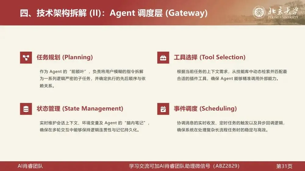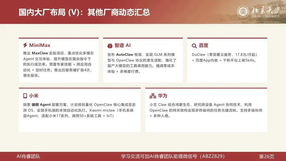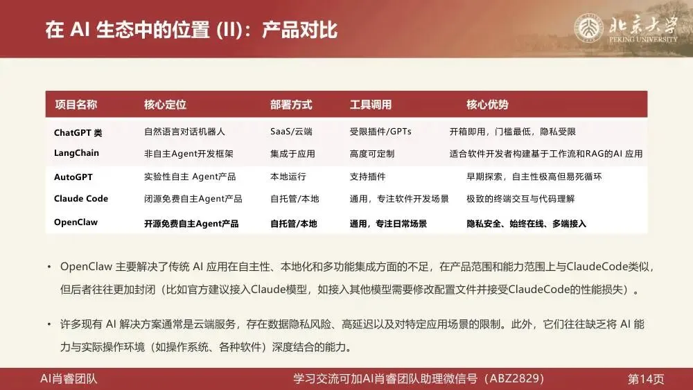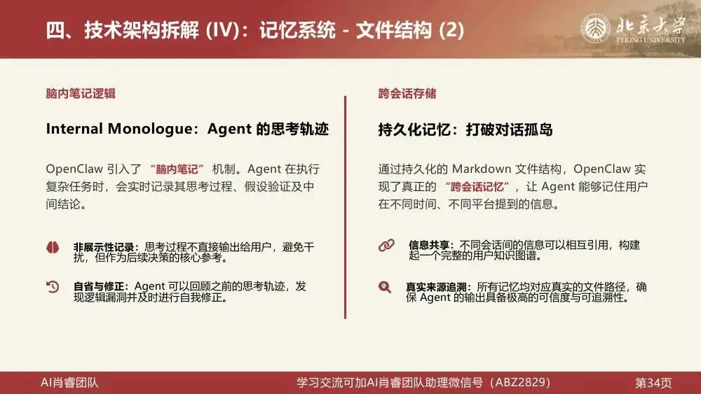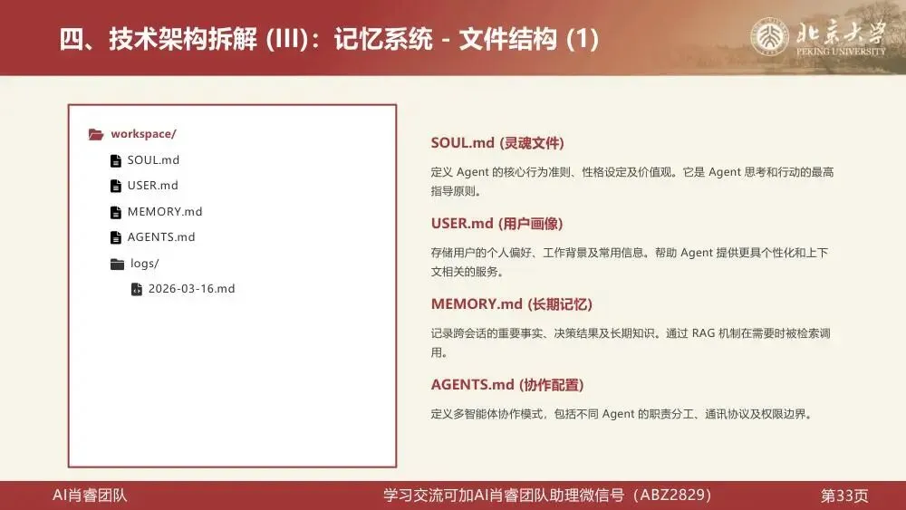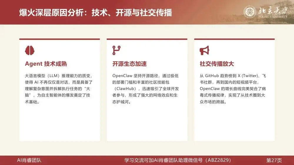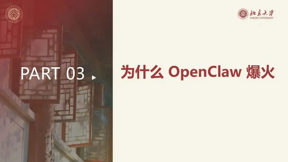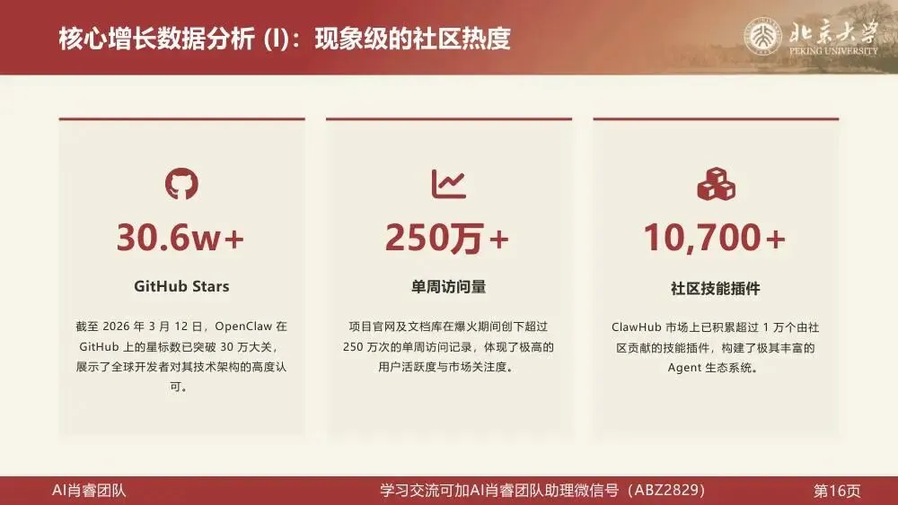 北京大学《OpenClaw龙虾使用入门》| 技术架构、生态、应用场景(附完整报告下载) 北京大学《OpenClaw龙虾使用入门》| 技术架构、生态、应用场景(文末附完整报告pdf下载地址) OpenClaw是一款开源的本地优先AI Agent平台,通过网关连接飞书、钉钉等常用应用,实现始终在线的自主任务执行与工具调用。其凭借平民化部署、强大技能生态、私有化记忆和多模型支持,推动了AI从“对话交互”向“自主行动”的跨越,开启个人AI Agent平民化时代。 未完待续,请参考完整版报告 完整报告请关注公众号(GIS极客)后台回复’北大OpenClaw1‘,获取下载链接。