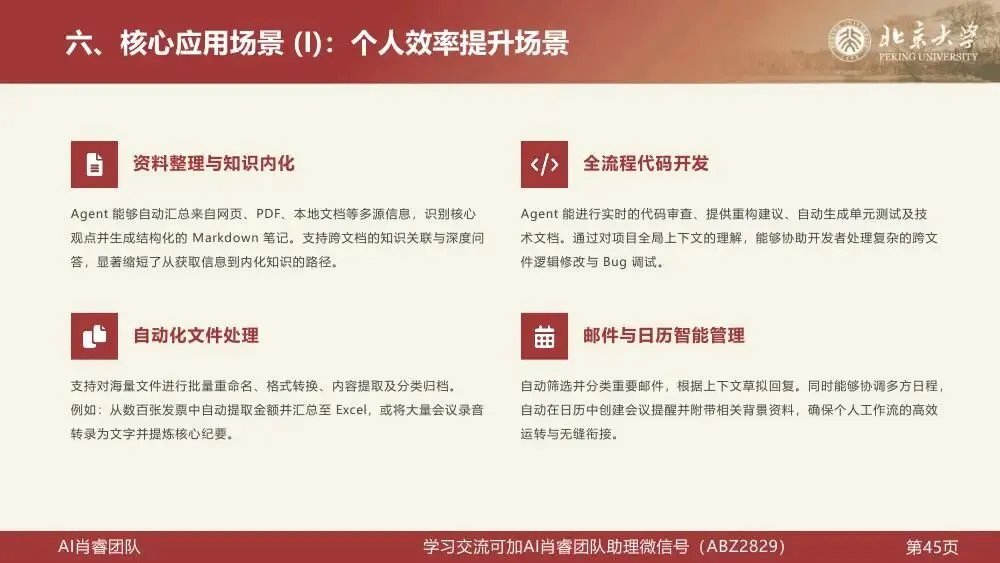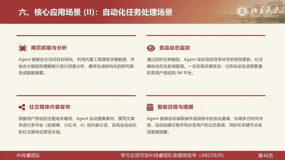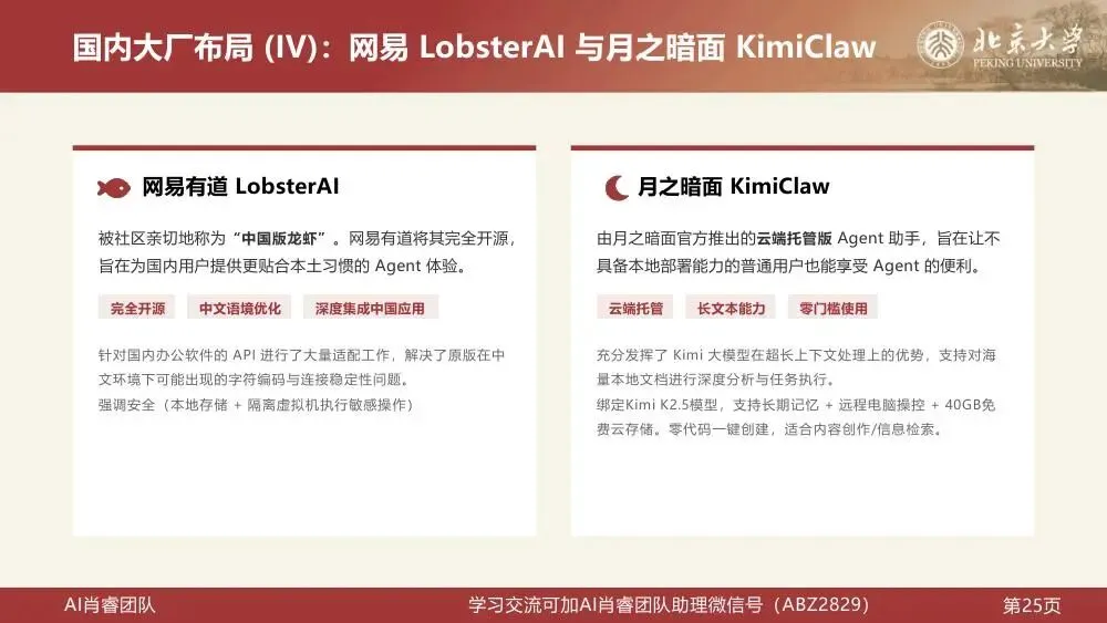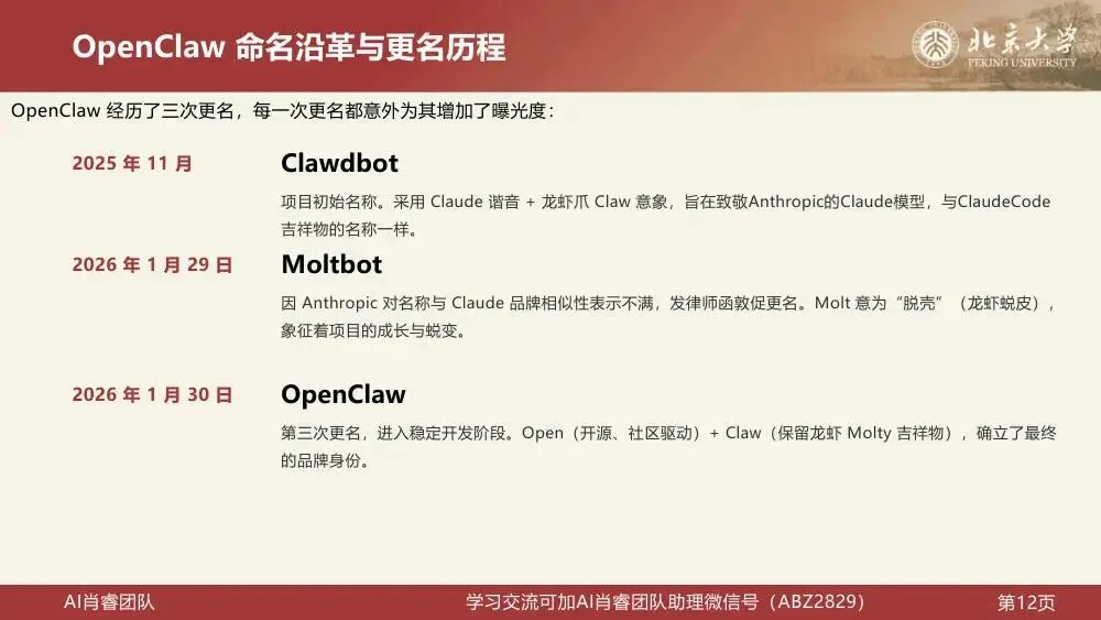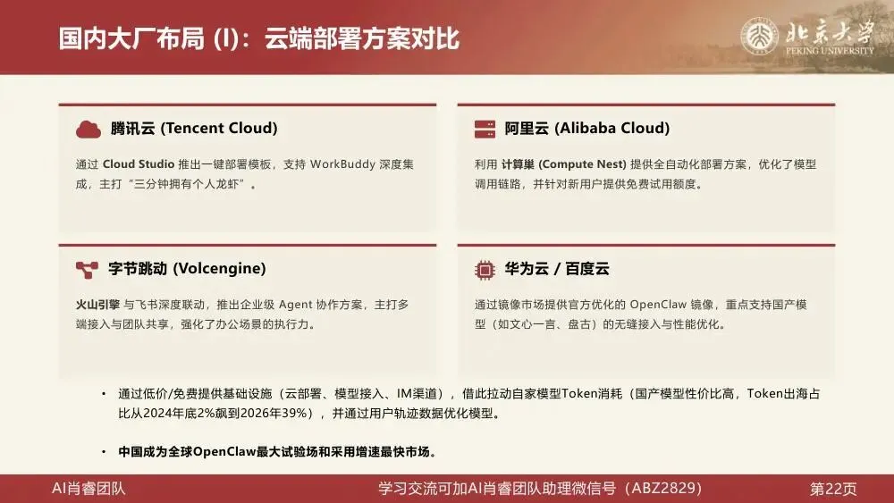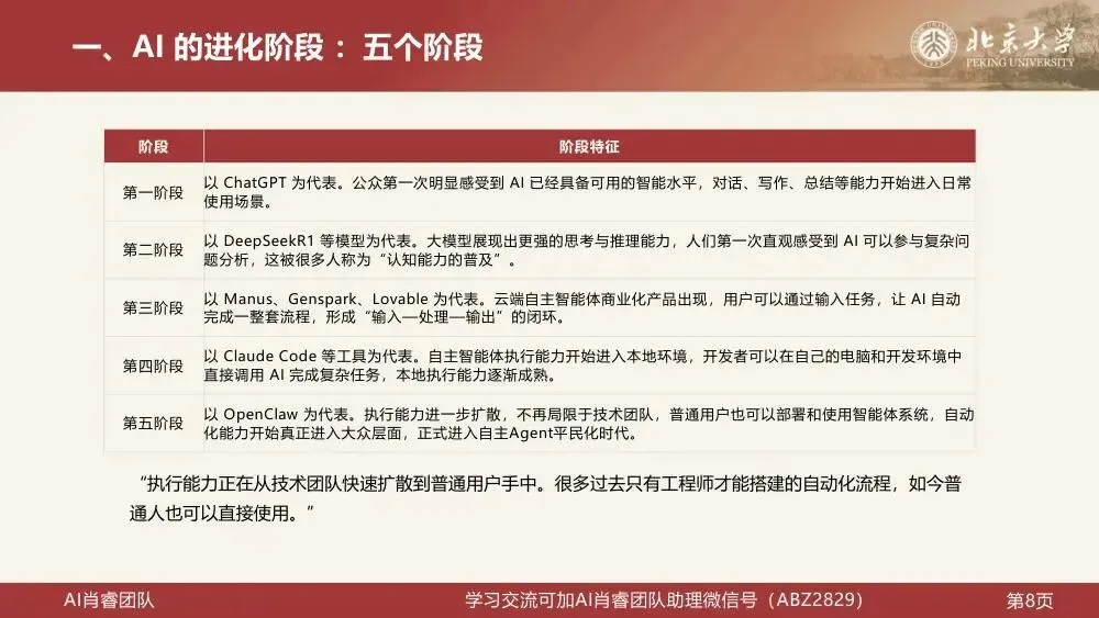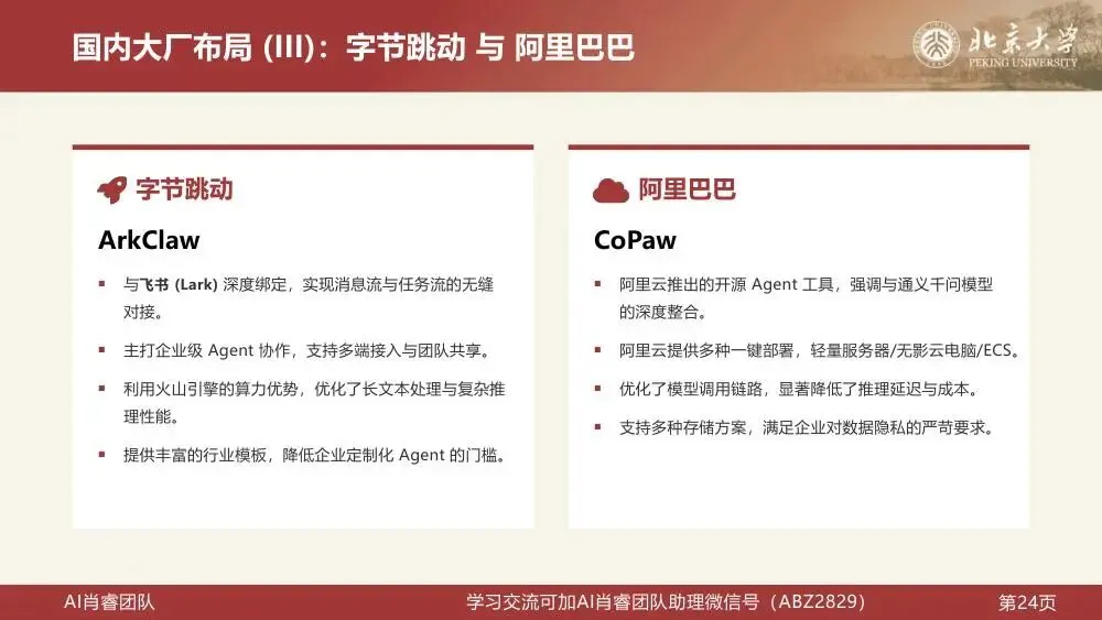 北京大学《OpenClaw龙虾使用入门》| 技术架构、生态、应用场景(附完整报告下载) 北京大学《OpenClaw龙虾使用入门》| 技术架构、生态、应用场景(文末附完整报告pdf下载地址) OpenClaw是一款开源的本地优先AI Agent平台,通过网关连接飞书、钉钉等常用应用,实现始终在线的自主任务执行与工具调用。其凭借平民化部署、强大技能生态、私有化记忆和多模型支持,推动了AI从“对话交互”向“自主行动”的跨越,开启个人AI Agent平民化时代。 未完待续,请参考完整版报告 完整报告请关注公众号(GIS极客)后台回复’北大OpenClaw1‘,获取下载链接。