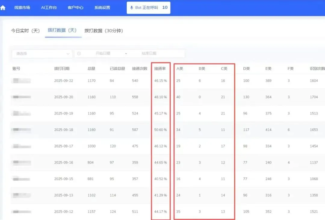 每天可拨打的电话数量是人工的5-10倍,人工一天只能拨打200-300通电话,机器人每天能打3000通电话以上,无须休息,按照设置指令,保质保量完成,相当于招了一个永不偷懒的员工。