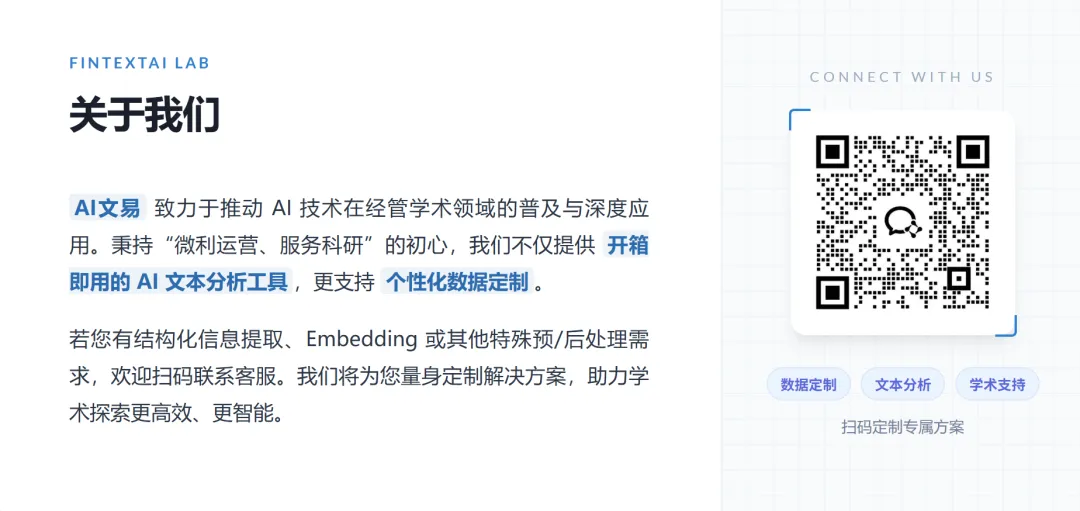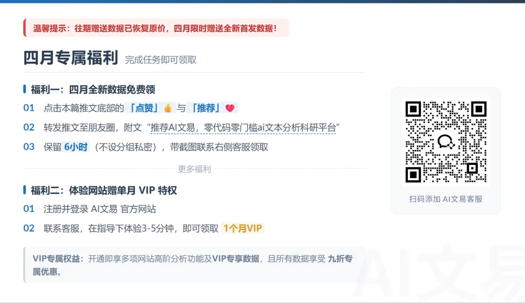 👉 如果你对这套数据感兴趣,或者想亲自体验一下“两步就能跑完AI文本分析”的AI文易平台,可以查看文末图片。我们还准备了专属客服,如果你在数据使用或平台操作上遇到任何问题,可以直接问。
