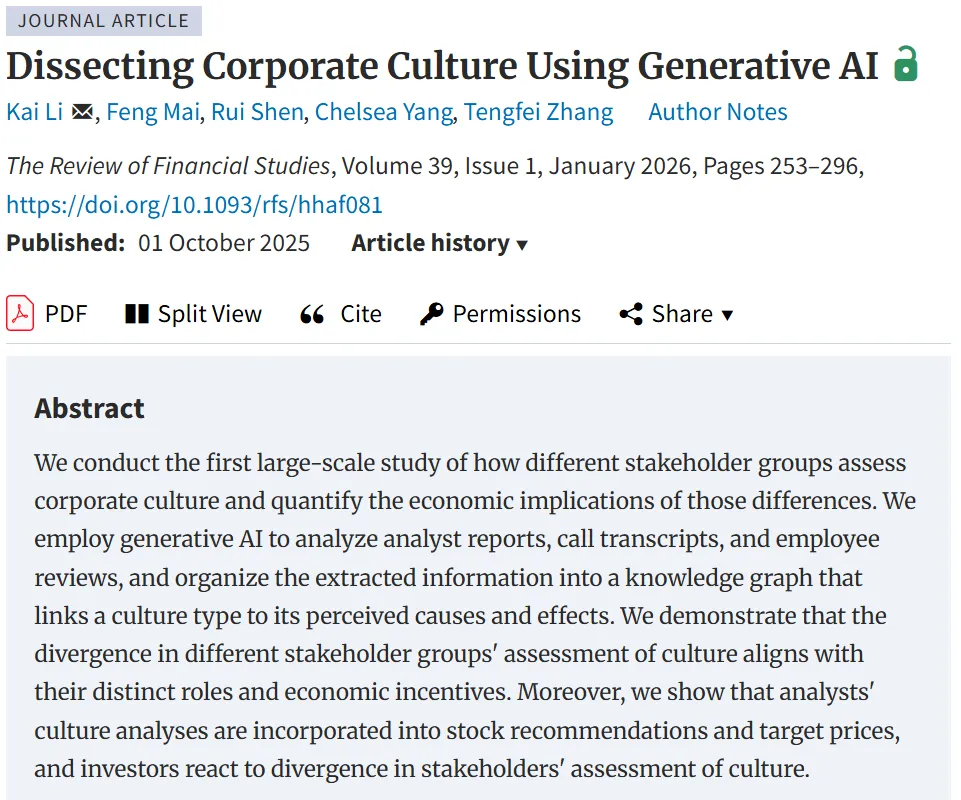 直到去年,RFS(Review of Financial Studies)上发了一篇论文 Dissecting Corporate Culture Using Generative AI (Li et al., 2025)。作者用生成式AI从分析师报告、电话会文本里提取企业文化因果三元组(事件→文化→结果),还比较了分析师、管理层、员工三方视角的差异。方法很漂亮,逻辑很清晰,但复刻起来……