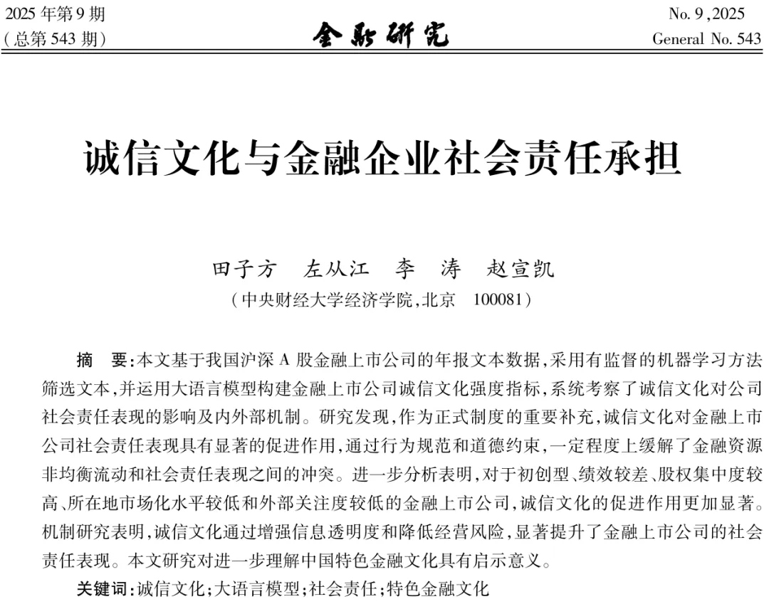 无独有偶,同年《金融研究》第9期的《诚信文化与金融企业社会责任承担》(田子方等,2025)聚焦中国A股金融上市公司,采用有监督机器学习筛选年报文本,并借助大语言模型(Qwen1.5-110b)构建了金融上市公司诚信文化强度指标。研究发现,诚信文化通过增强信息透明度和降低经营风险,显著提升了金融企业的社会责任表现。