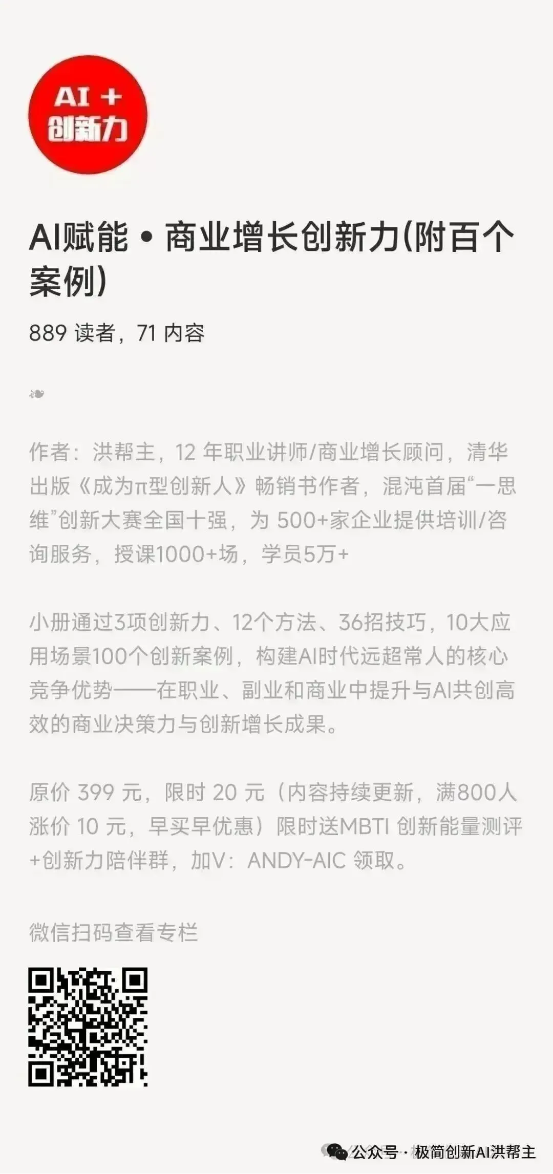 最后送个福利:想系统提升AI时代的商业增长创新力,用”极简创新”方法论提升你的核心竞争力,欢迎订阅帮主的【AI+商业增长创新力】 小册。