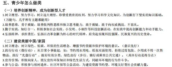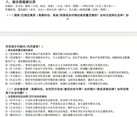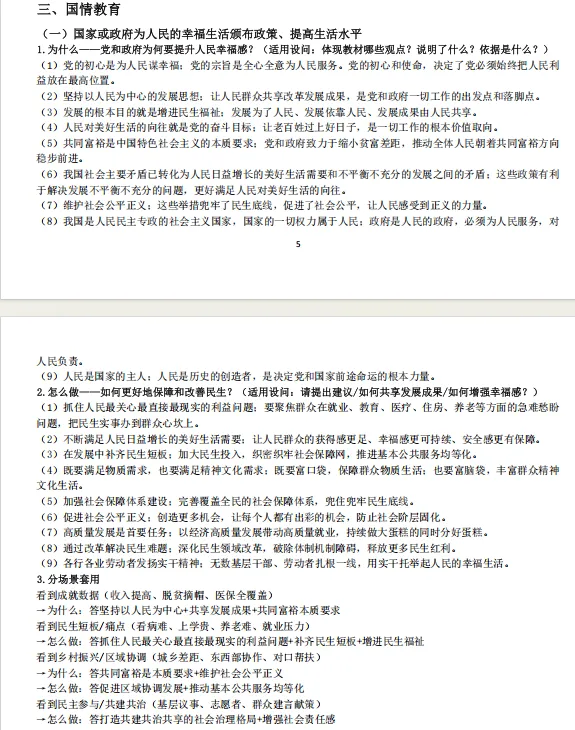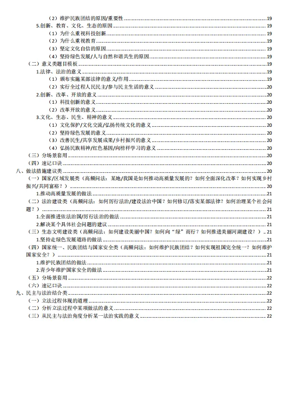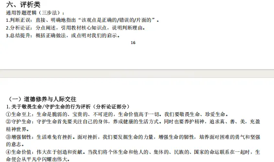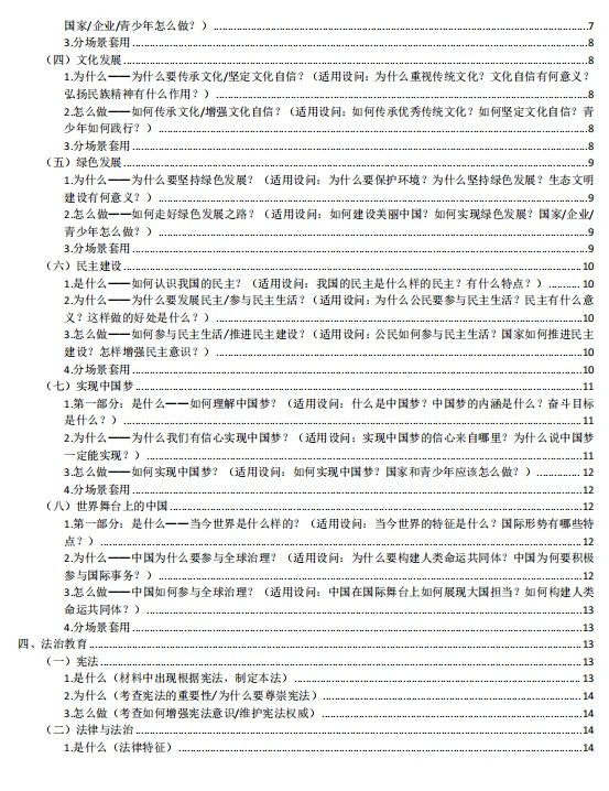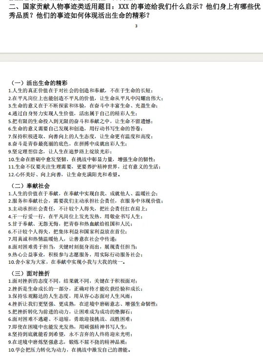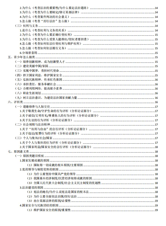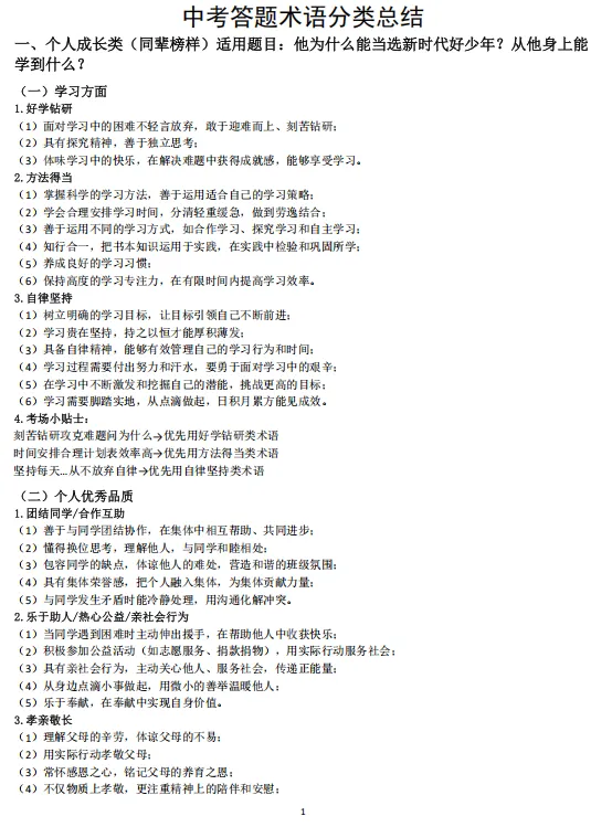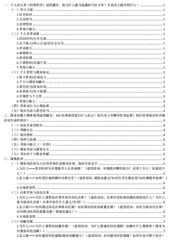 1.本资料分文分为个人成长类、国家贡献人物事迹类、国情教育类、法治教育类、青少年怎么做类、评析类、原因意义类、做法措施建议类、民主与法治结合类。先总结中考中考频较高的生命安全与健康教育(主要考个人成长类、国家贡献人物事迹类)、国情教育类;法治教育三大主题教育的高频答题术语;再结合中考中常考的一些题型从不同方面总结一些答题模板;这样编排可以帮助不同层次的学生尽量在考场上能够运用起来。