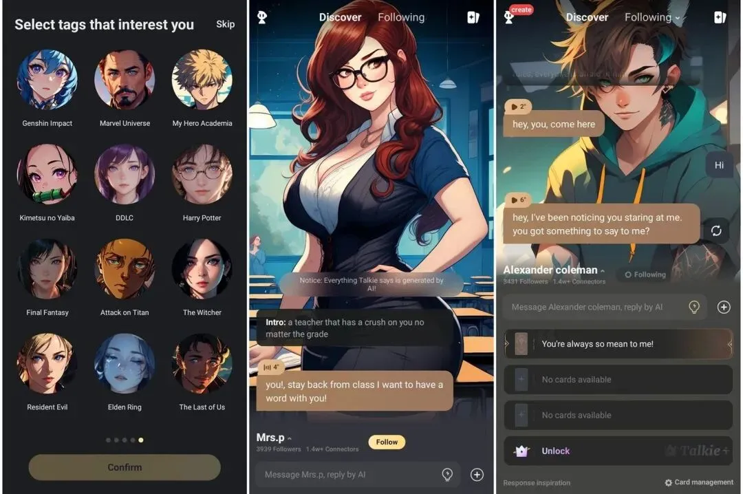 《星野》更像升级版的「Glow」,除了 AI 聊天,还加入了 UGC 和卡牌玩法,予人一种玩 AVG 的感觉。这款产品由张前川(原今日头条产品负责人,去年加入 MiniMax)主导,海外版本《Talkie》于 2023 年 6 月发布后迅速走红,一度跻身美国 Google Play 下载总榜 TOP6,截至目前,下载量已超 1000 万。点点数据显示,其日活已破百万,月活数据在同类产品中仅次于《Character AI》。