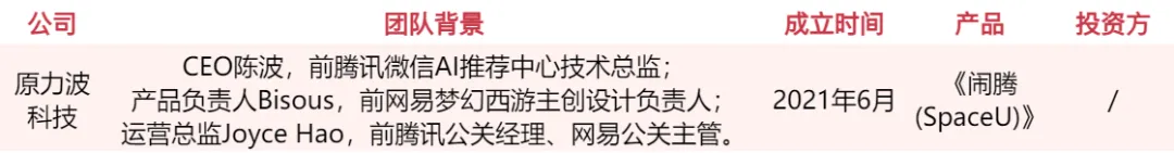 北京原力波科技(曾用名:北京达不溜科技)是一家围绕 AI、区块链技术的元宇宙创业公司,团队既有从事 AI 领域超过 12 年的资深人士,也有参与过游戏大厂重要项目的从业者。此前公司上线了一款结合 AI 的虚拟场景社交应用《Node 闹腾》,后者于 2022 年 10 月更名为《SpaceU》,并宣称「全新起航」。