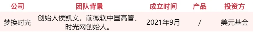 梦换时光(Time Traveller)总部位于北京,在美国湾区设有分部。团队专注 XR+AI 领域的探索,并聚焦社交游戏及营销业务,已获得美元基金的 A 轮融资。公司核心成员来自微软、字节跳动、腾讯等大厂,其中 CEO 侯凯文曾在微软美国总部和中国工作近 10 年,先后担任过微软中国区副总经理兼大中华区 OEM 总监等职位,2005 年,他创办了电影媒体和电商服务平台「Mtime时光网」,后者于 2016 年被万达院线收购。