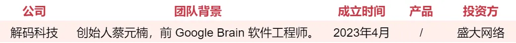 浙江解码科技(Decoda.AI)是一家专注 C 端出海娱乐+游戏应用的初创企业,成立不久就获得了盛大网络的投资。其创始团队来自 Google Brain、哥伦比亚大学和上海交通大学,公司研发人员主要集中在美国硅谷,并在上海、宁波设有工作室。据招聘信息,解码科技或有面向欧美市场的重度 AIGC 游戏类产品。