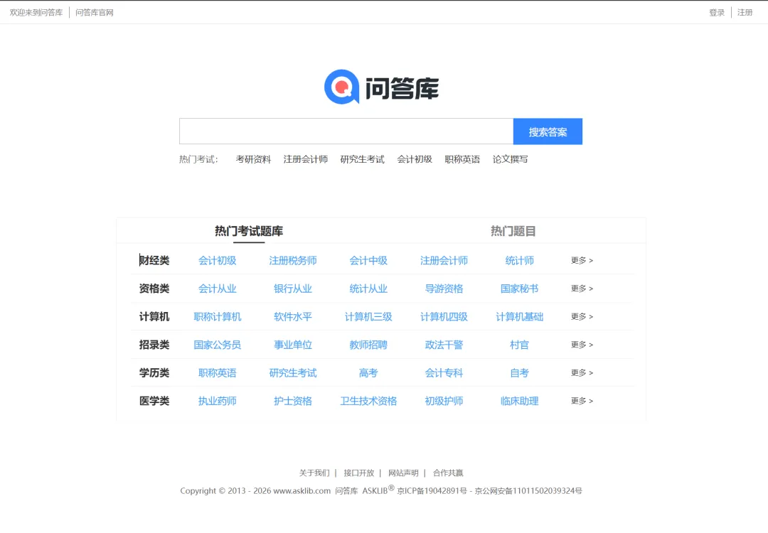 问答库是一个在线资源平台,提供了丰富的考试题库和问答服务,涵盖了财经类、资格类、计算机类、招录类、学历类、医学类等多个领域的热门考试