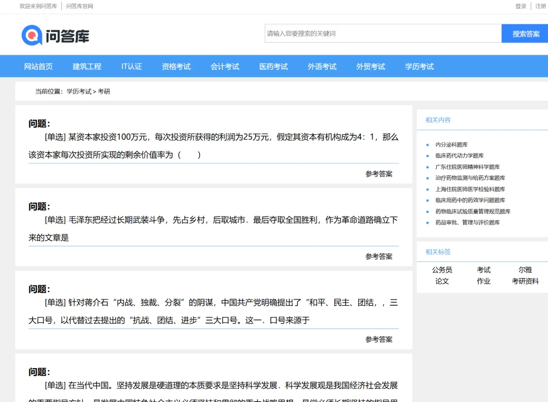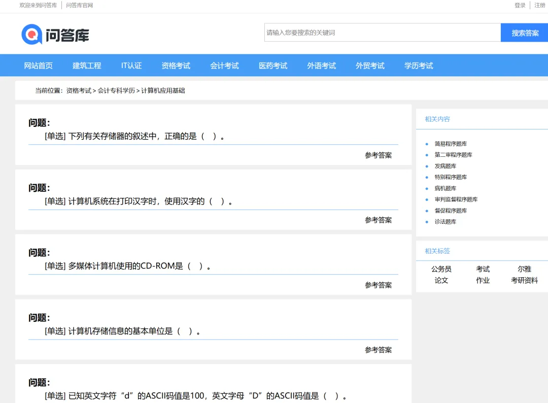 问答库收录了数百万的公务员考试,建筑工程,IT认证,资格考试,会计从业,医药考试,外语考试,外贸考试,学历考试等各类题库以及一些常见的普通练习的题目题库