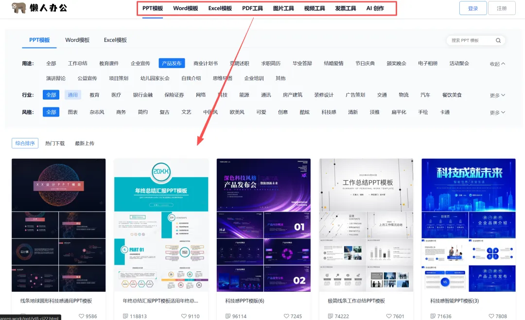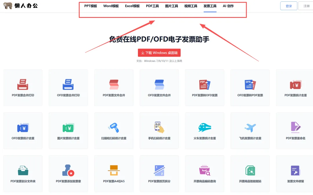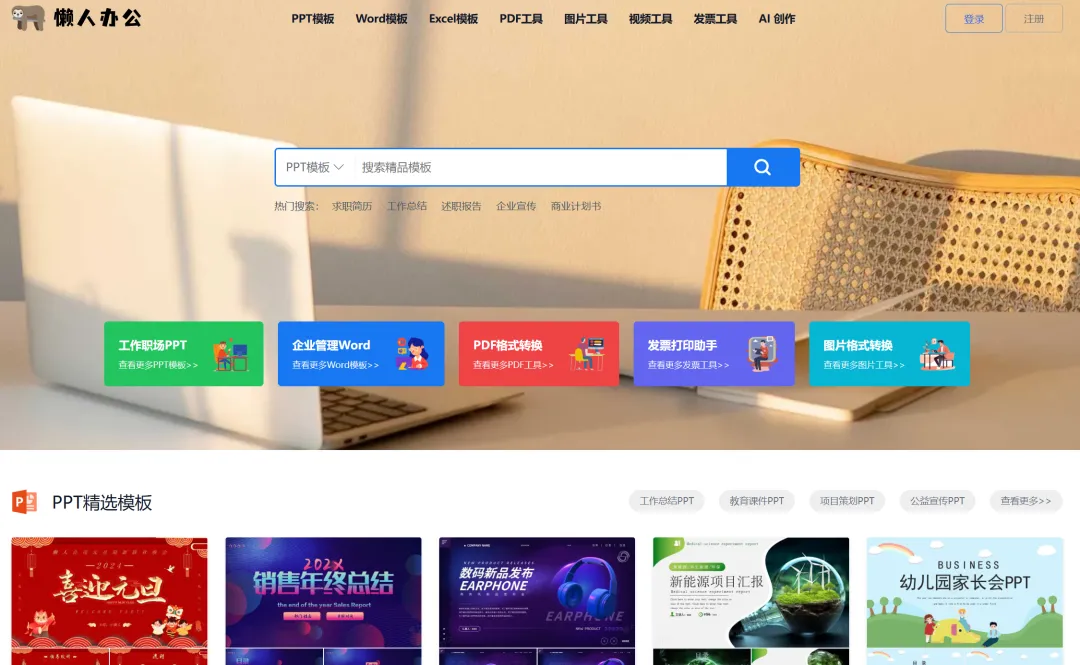 它提供了PPT模板、Word模板、Excel模板、PDF工具、图片工具、视频工具、发票工具以及AI创作等多种功能和服务