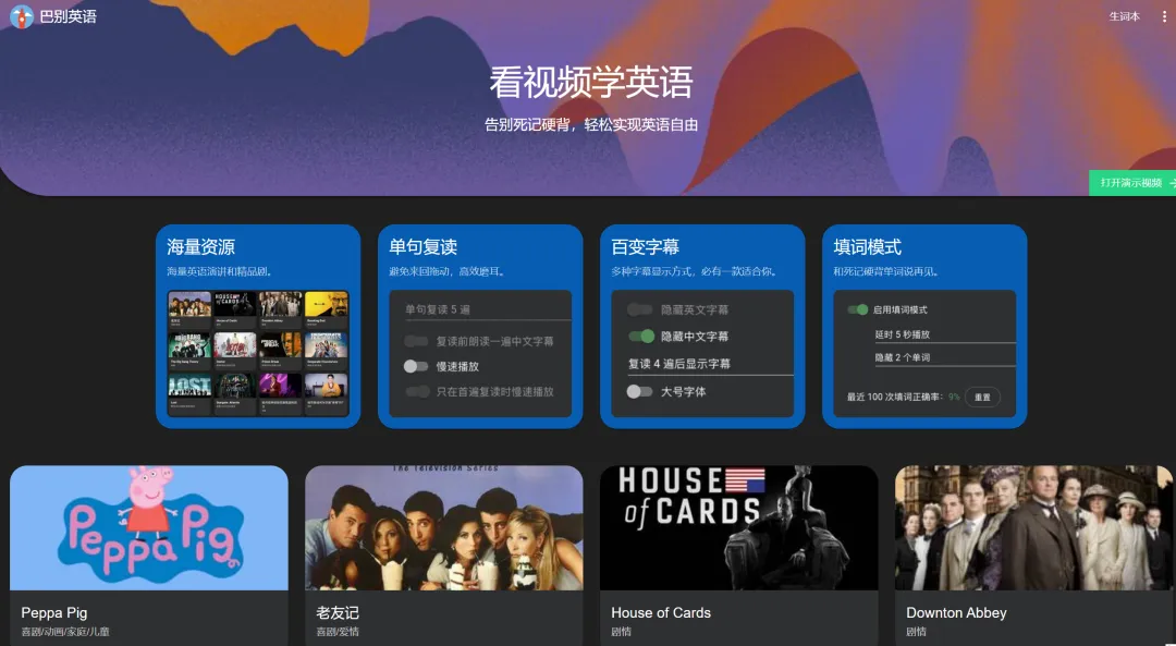 巴别英语-看美剧学英语该网站是一个语言学习或翻译服务平台,我们看视频学英语,告别死记硬背,轻松实现英语自由,提供海量英语演讲和精品剧