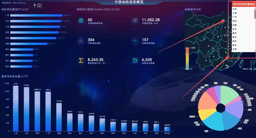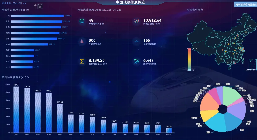 我们可以通过切换城市查看开通线路数、总里程、在建线路、客流汇总等信息,数据更新及时