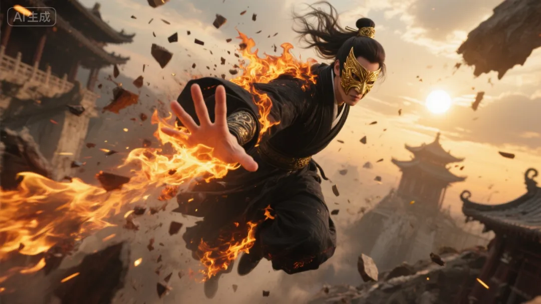 1.提示词:正面特写镜头,古装男子从高空俯冲而下,衣服燃烧成灰烬碎片飞散,发丝带着火焰剧烈向后飘动,左手前伸手掌,掌心出现烈火,超现实风格,电影级动态光影,粒子特效表现燃烧轨迹,超广角镜头增强视觉冲击力,背景是黄昏云层被气浪撕开。浑身黑气缭绕。脸的一半戴着黄金华丽面具。太阳在背景闪烁。