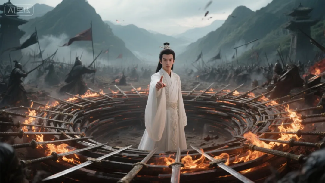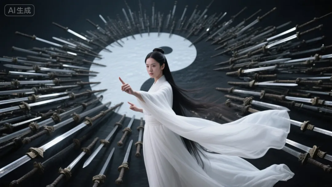 2.提示词:侧身特写,超广角视角,身穿白袍的美女修真者,长袍夸张地飘荡,长发飘逸,并起两根手指向前指,身后超大面积密密麻麻层层叠叠的长剑组成太极图造型剑河,所有长剑统一方向射向前方,剑身古朴,武侠大电影风格,背景昏暗简单,玄幻,古朴,唯美,惊艳,高清。