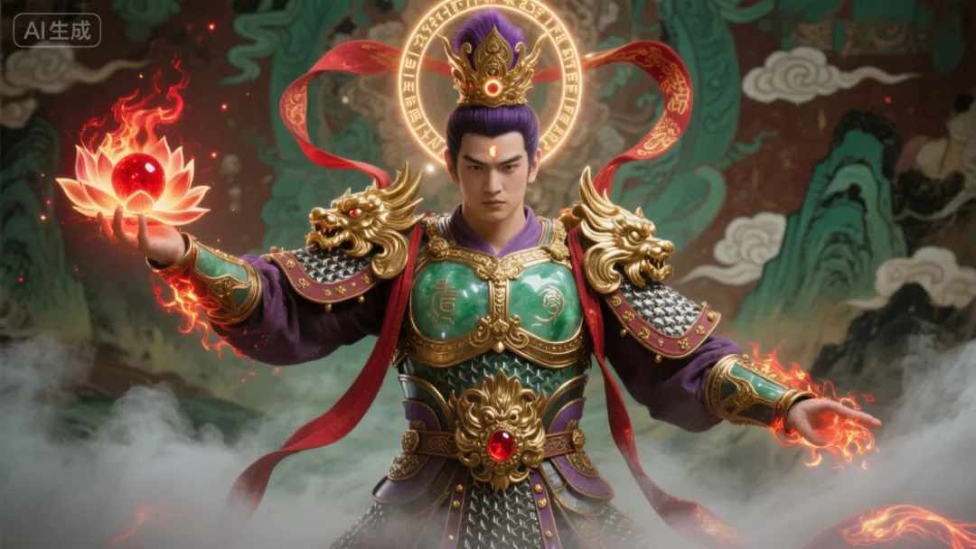 3.提示词:广目天王全身战甲特写,人类俊帅面容配梵文光环,五官端正俊美,容颜俊美,佛教表情,额头一个闪光标志。整齐帅气的发型。青玉鎏金明光铠镶嵌道教云篆金纹,帅气精致的凤翅紫金冠投射暖色轮廓光于玉石面甲,关节处熔岩发光装置激活,动态粒子生成业火红莲与火星光轨。龙口喷出一颗红色金丹,火焰环绕。唐代鎏金狮首肩甲下悬朱红丝绦,磁流变披风与锁子甲形成刚柔对比。背景敦煌壁画青绿山水基底,实时流体祥云扰动场配合参数化曼陀罗地纹,晶莹透明的漂亮|莲花纹。佛光体积渲染穿透各向异性介质。超清摄影展现甲片锻造肌理,战甲底部薄纱烟雾与足尖火焰三昧纹自然过渡,袖口双针盘金绣云雷纹立体浮雕,腰带花丝镶嵌鸽血红宝石反光。悬浮于烟雾中。人类俊帅面容配梵文神圣光环,五官立体雕塑感,佛教庄严微表情,1额头天眼纹饰发光特效。青玉冷釉质感明光铠镶嵌道教云篆鎏金纹,凤翅紫金冠暖光晕染玉石面甲,胸甲龙首浮雕搭载呼吸脉冲光效系统。赤龙精密机械骨骼沿曲线盘绕,逆鳞物理碰撞模拟系统激活,龙身微孔透光结构,关节熔岩发光装置喷发动态火焰粒子。龙口喷射金丹能量核心,火焰流体动力学模拟。唐代鎏金狮首肩甲配朱红丝质流苏,磁流变柔性披风与硬质锁子甲材质对比。背景青绿矿物颜料渐变基底,参数化曼陀罗几何地纹,实时流体祥云扰动场。佛光体积云穿透各向异性介质,8K超清摄影呈现甲片锻造肌理,Octane渲染强化鎏金氧化层次,战甲底部半透明烟雾流体与三昧真火特效自然过渡,袖口盘金绣云雷纹高精度法线贴图,花丝镶嵌腰带鸽血红宝石焦散反光。铠甲搭配紫色飘带,透明浅紫纱衣。