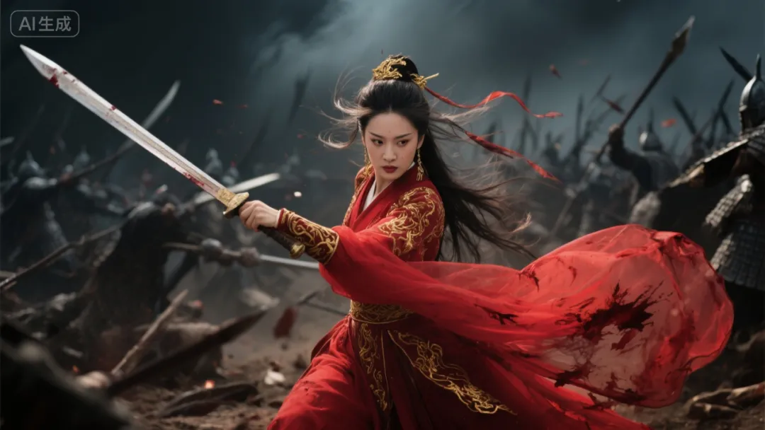 4.提示词:高饱和但低明度,高曝,过曝,暗调,伦勃朗光,强烈明暗对比,高反差, 虞姬,红色轻纱水墨裙,金线刺绣,浴血奋战,凌乱,癫狂,耳边有两缕随风飘舞的碎发,黄金比例的五官,绝世美人,英气立体的五官,凌厉,舞剑,背景是古战场。厮杀惨烈,史诗级古装电影战争场景。实拍。低饱和低明度。