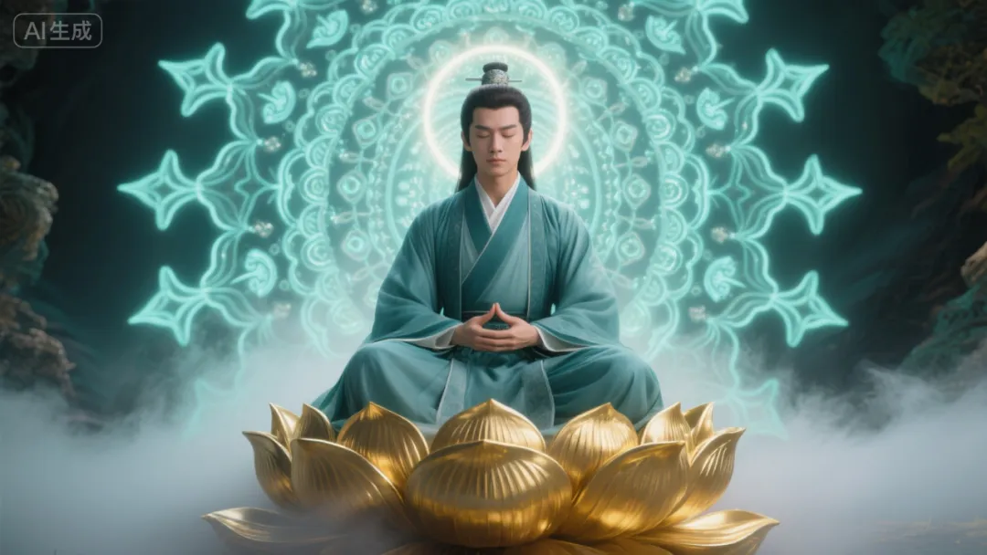 5.提示词:一个青衣古装男侠客。坐在庞大的金色的莲花台上。闭目盘坐双手掐佛印。身后有。万向花纹荧光闪烁。脑袋后面有一圈。光环。身体环绕着。淡淡的白雾。实景拍摄,电影质感,广角。