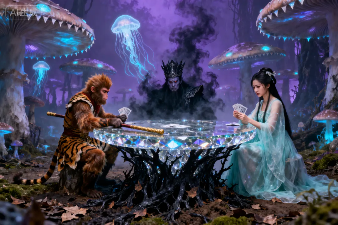 6.提示词:有三个角色围绕着一个水晶圆桌子。第1个角色是神话故事中的地狱阎王他的下半身已经没在黑雾中。。第2个角色是孙悟空。第3个角色是林黛玉,他们正在打纸牌。周围是奇形怪状的高大蘑菇森林。水晶桌子的下半部分是黑色的枯枝败枝叶并且逐渐长入到土地里。真人写实电影风格剧照。玄幻诡异风格。空中有几个幽灵水母在漂浮。