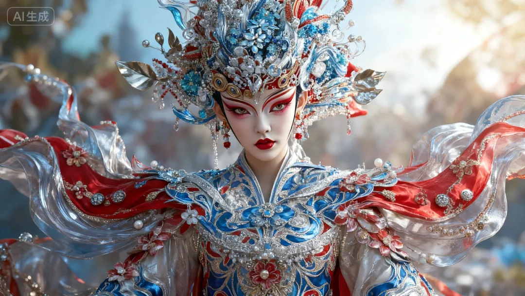 7.提示词:图中展示了一位身着华丽服饰的人物。人物的头部装饰极为繁复,头饰以银色为主,镶嵌着大量蓝色、白色和红色的珠宝、花朵造型装饰以及精致的金属部件,形状多样,有花朵、叶片、珠串等,层层叠叠,立体感十足。 人物的妆容浓艳,眼妆部分以红色和白色为主,线条细长且上扬,眉间有红色装饰,唇色鲜红,整体妆容与头饰和服饰相呼应。 服饰同样华丽,以红色、蓝色和银色为主色调,布满了精美的花纹和装饰。肩部和衣袖处的布料呈现出流动的形状,仿佛随风飘动,布料上装饰有花朵、珠片等,细节丰富。整体造型充满了浓郁的传统艺术风格,色彩鲜艳,装饰繁复,给人一种华丽且精致的视觉感受。