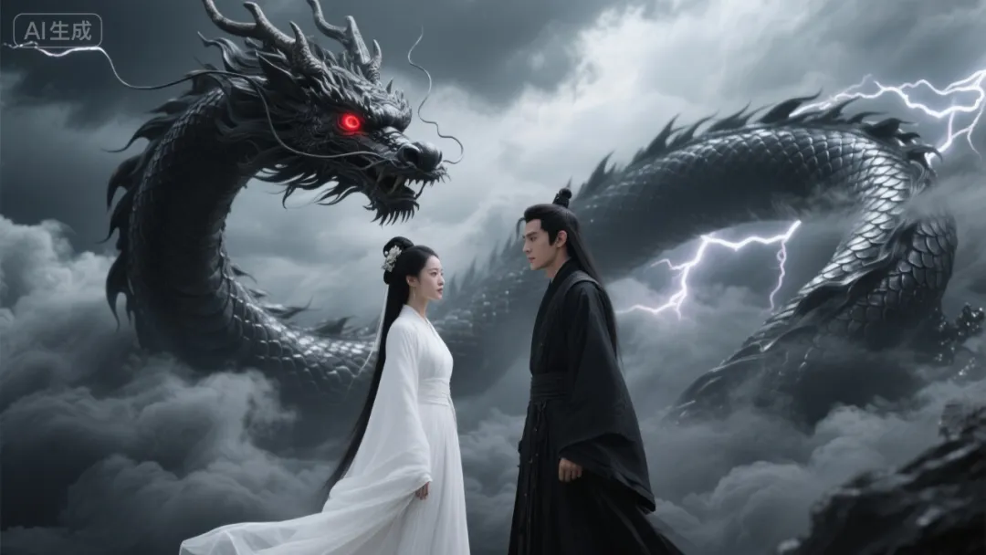 8.提示词:侧面视角,一个黑色的中国巨龙头顶上站着一个微小的白衣如雪的绝美衣裙飘飘的古装女子。对面是一个白色的中国巨龙,头上站着一个黑衣如炭的微小俊俏古装男子。这两个巨龙的背后分别是翻滚的阴云。龙的眼镜闪着红色光芒,龙身鳞甲闪着光泽,电影质感奇幻电影风格。大师作品史诗级场景。广角。阴云之中电光闪闪。