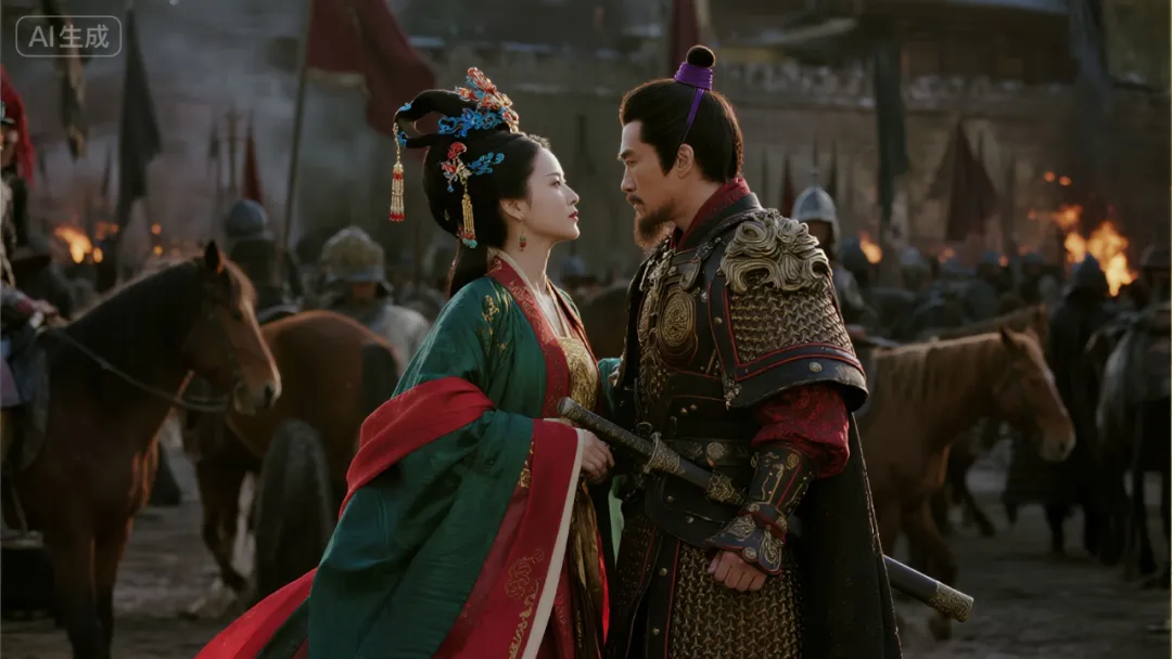 9.提示词:全景大广角视角,烽火四起,战马嘶吼,混乱的古战场中央。全身青红汉服虞姬(左):瓜子脸瓷肌透桃腮,柳叶眉配金黑眼线丹凤眸,银睫蝶颤,朱釉唇泛水光。玄色点翠冠嵌赤宝蓝晶白玉雕花,珠翠流苏垂颊。 全身项羽站在右侧(右):剑眉入鬓金瞳凛冽,面覆古铜釉彩,玄纹勾颧骨,乌髯如戟。紫金冠镶盘龙赤玉,蟒纹黑绒氅衬金鳞甲。 大师级摄影,4K高清。双人侧身对视,虞姬仰首悲怆,项羽垂眸握剑。画面为暗调,低饱和色调,电影质感,全景双人全身视角。