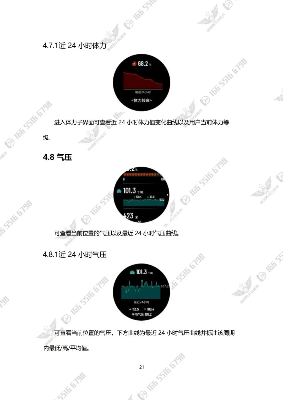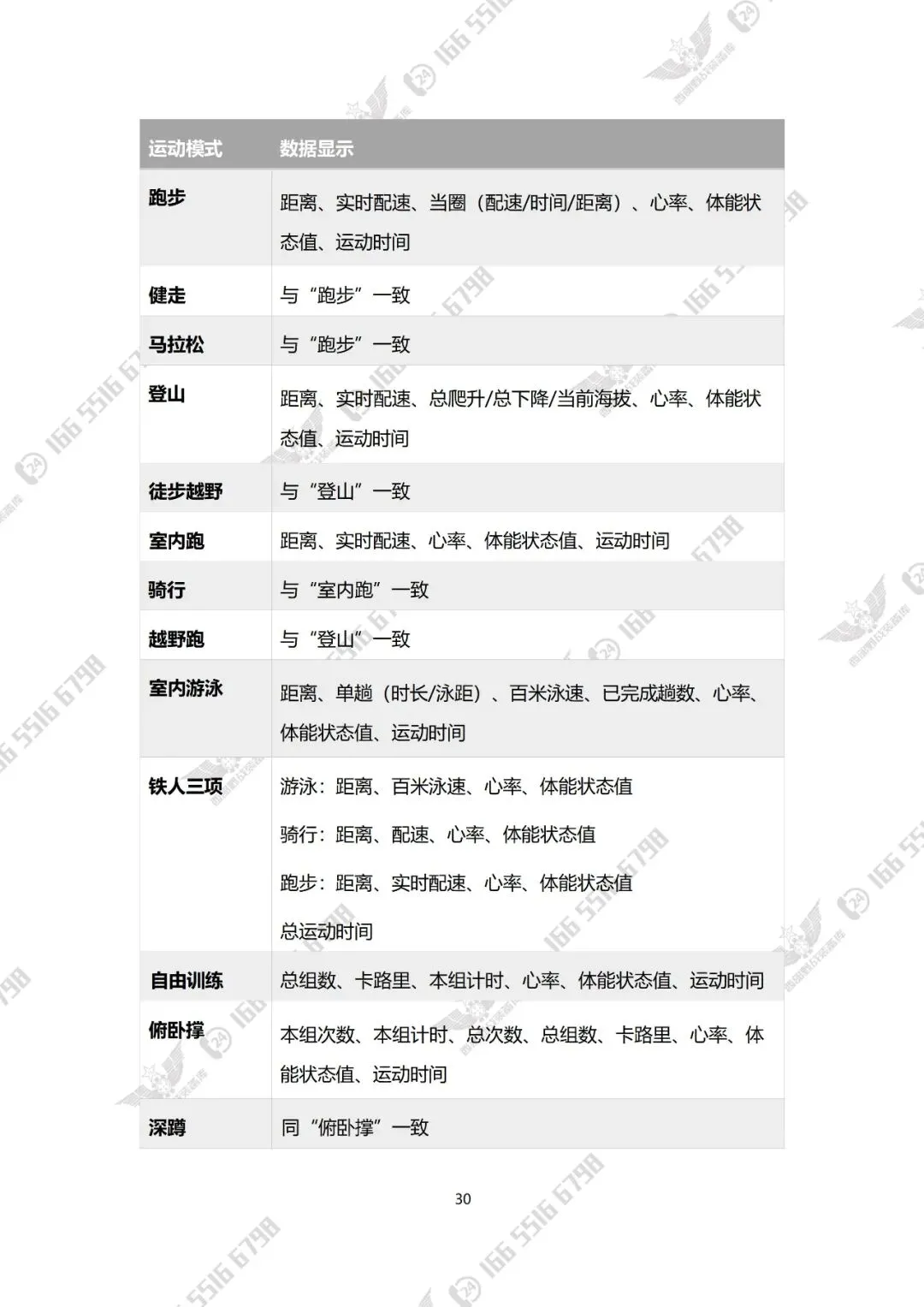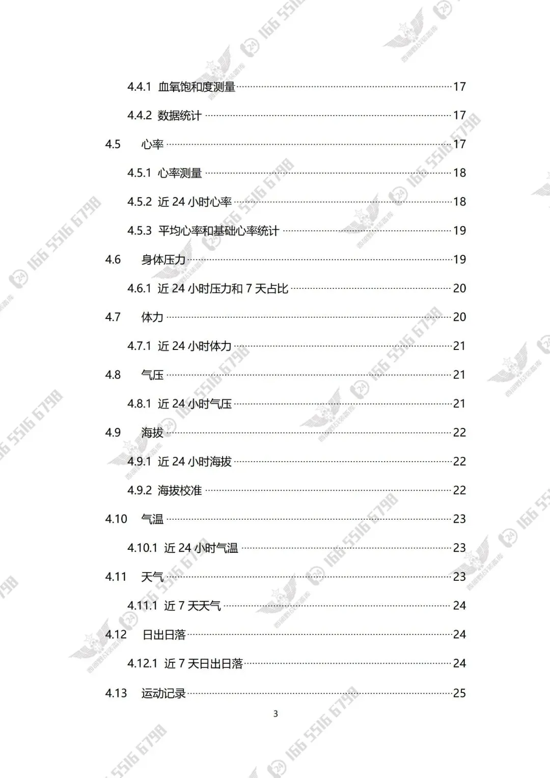 主要功能:步数、运动能耗、血氧饱和度、心率、身体压力、气压、海拔、气温、天气、日出日落、运动记录、训练计划等功能;