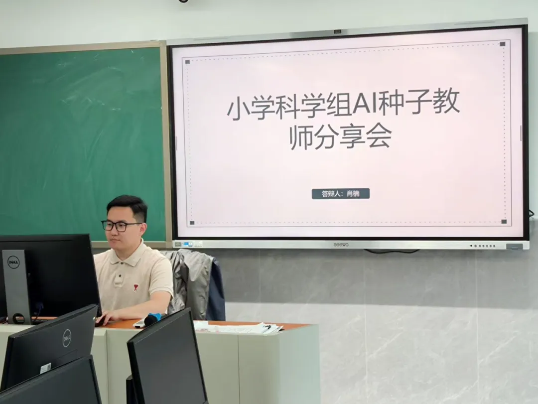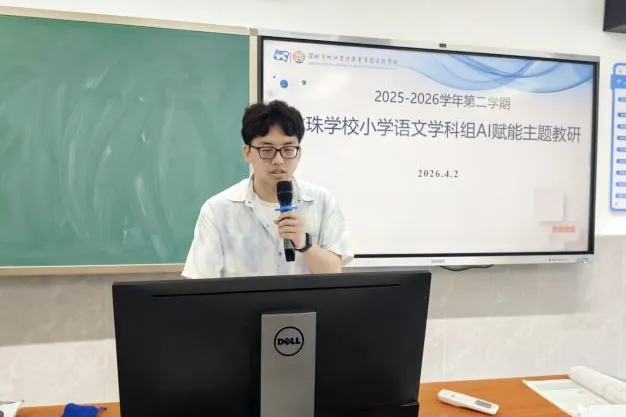 4 月 2 日,小学语文组开展 “AI 赋能全学段:小学语文智慧教学新范式” 主题教研。AI 种子教师曾景航、徐梦轩以 “飞象老师” 为例,分享 AI 在各学段的应用:低段生字词游戏化练习、中段古诗情境教学、高段思辨探究学习,通过一句话指令即可快速生成互动动画与分层学习任务,助力高效智慧课堂。
