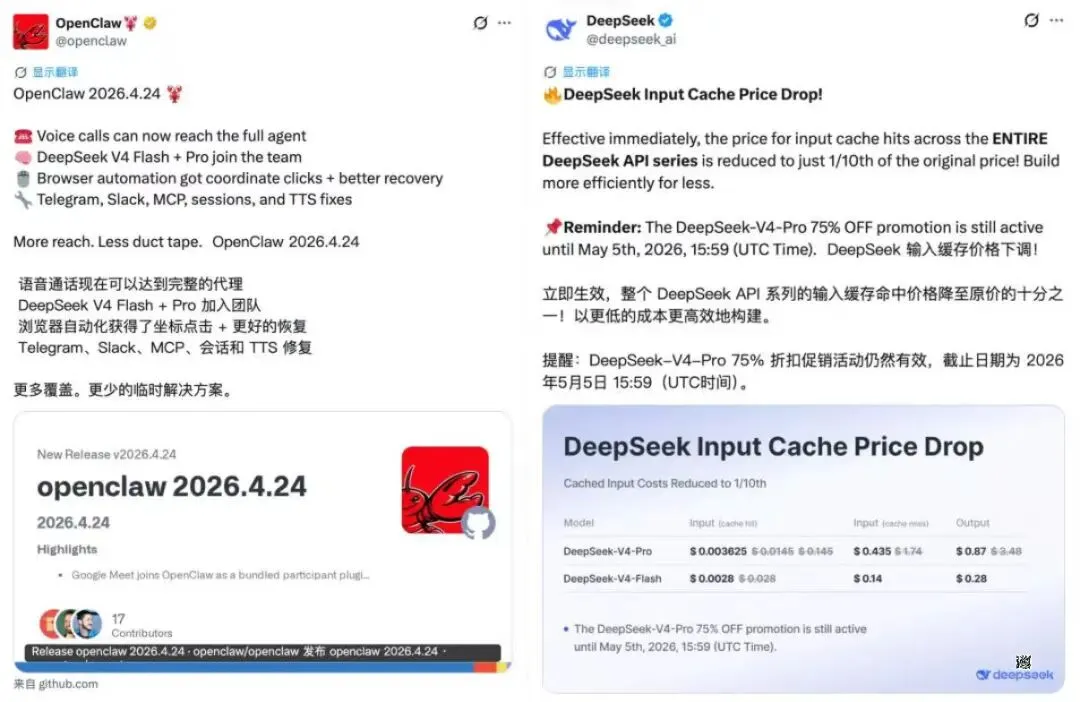 OpenClaw「龙虾」正式发布 2026.4.24 版本更新,接入 DeepSeek V4 系列模型,DeepSeek V4-Flash 更是被设为新用户的默认首选模型。与此同时,DeepSeek 官方也更新了 API 文档,宣布下调 DeepSeek 全系列 API 服务的价格,输入缓存命中的价格降至原有价格的 1/10,Pro 模型在 2026 年 5 月 5 日前叠加 2.5 折限时优惠。调价后,DeepSeek-V4-Pro 模型输入(缓存命中)降低至 0.025 元 / 百万 Token,DeepSeek-V4-Flash 输入(缓存命中)降低至 0.02 元 / 百万 Token。