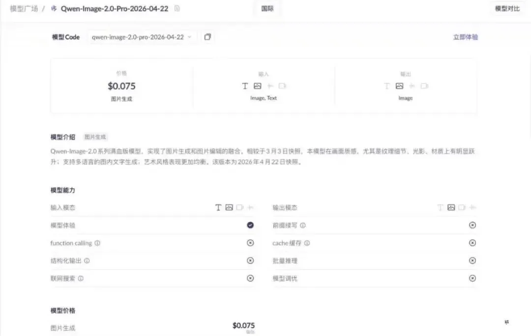 阿里云于 4 月 27 日在百炼平台正式上线 Qwen-Image-2.0-Pro,作为 Qwen-Image-2.0 系列的「满血版」模型,它针对 AI 生图领域的多个痛点完成针对性升级,为用户带来更高效、优质的图像创作体验。Qwen-Image-2.0-Pro 在画面质感上实现了明显跃升,尤其在纹理细节、光影层次和材质表现上的优化最为突出。无论是金属表面的冷冽光泽、织物纤维的细腻纹路,还是自然场景中光影的渐变过渡,都能呈现出更贴近真实世界的视觉效果,满足用户对高精度图像的创作需求。以往用户进行图像创作时,往往需要在文生图工具和图像编辑工具之间来回切换,操作流程繁琐且效率低下。Qwen-Image-2.0-Pro 打破了这一局限,将文生图与图像编辑整合进同一框架,用户只需通过自然语言指令,就能直接对图片中的物体、文字、风格等元素进行修改。