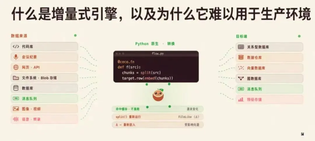 开源数据框架 CocoIndex 正式推出 V1 版本,此次更新对底层引擎进行了完整重写,旨在进一步优化 AI 智能体处理多源数据的能力,帮助开发者更高效地将代码库、文档、PDF 等各类数据源持续转换为可直接查询的结构化上下文。相较于此前版本,CocoIndex V1 最大的变化之一是摒弃了自有配置语言。过去,开发者需要通过专属 API 来描述数据流,这不仅增加了学习成本,调试和测试也多有不便。V1 版本将这一流程改为直接编写普通 Python 函数,开发者可以像处理常规代码一样为这些函数打断点、运行单测,大幅降低了上手难度。V1 版本改用本地嵌入式存储,用户只需通过 pip install cocoindex 完成安装,即可直接启动框架,无需额外配置数据库环境,让使用流程变得更加轻量化,也更适配快速迭代的开发场景。