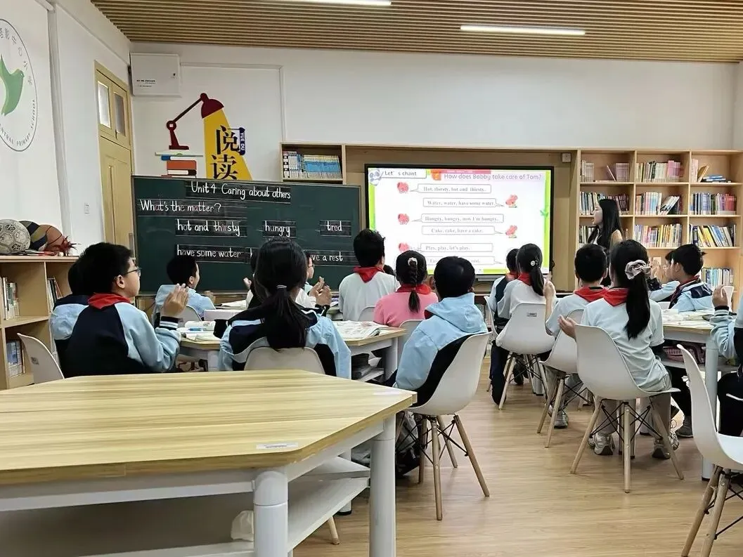 本次示范课由四年级王雨欣老师执教。课堂立足单元核心目标,课堂伊始,王老师通过趣味歌曲、节奏chant激活学生已有知识,带领学生认读并运用核心句型,快速搭建语言支架;随后依托教材文本,引导学生梳理对话逻辑、理解情境内涵,逐步实现语言的理解与运用。朗读环节中,借助平板开展原声跟读与智能纠音,精准纠正发音问题;同时设计互动语音游戏,让学生在小组合作的趣味情境中完成语音练习,有效夯实语言基本功。拓展环节设置分享活动,将单元知识与真实生活相连,引导学生感悟身边的关爱行为,实现语言能力、思维品质与情感素养的协同发展。