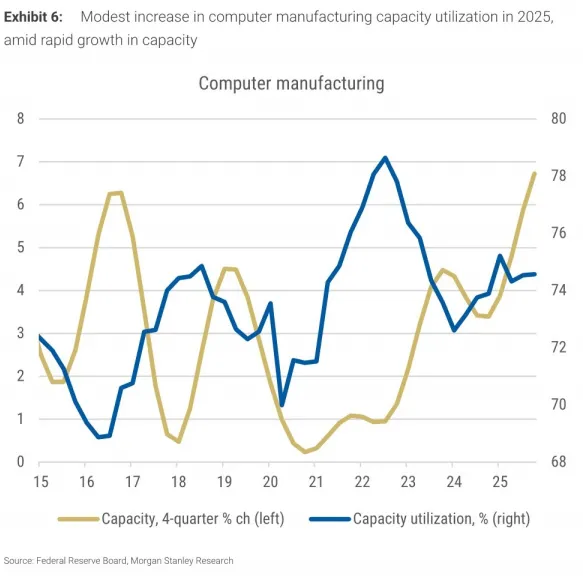 这些行业它的产出以及劳动生产率增速,远远超出了其他高暴露行业。报告专门针对计算机和电子产品制造业展开了分析,结果发现它在2025年的时候产能利用率仅仅是温和地上升了些,但产出增长速度却极其快。这种“产出扩张处于无显著产能压力的状况下”恰恰就是资本深化的典型特性,企业针对AI相关设备、算力以及软件等方面大量投入,从而致使相同数量的劳动力与设备能够产出更多产品。也就是说,AI的建设阶段自身就在促使经济增长了,并非仅仅是未来的潜在收益而已。这一发现对于领会AI对GDP的短期贡献而言是极为关键的,它并非是遥远未来的事情,而是当下正在出现的投资以及产出乘数效应。