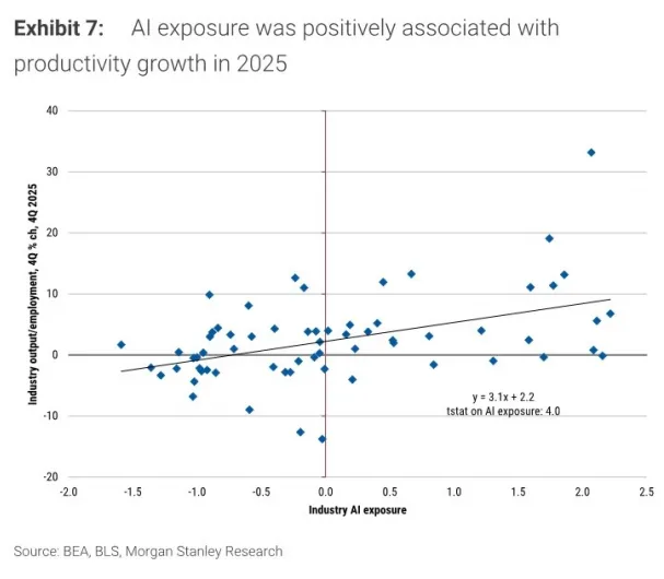 这份报告借助跨行业散点图进行分析从而发现,就算把那些被划定为高AI暴露的行业因素全部剔除掉,其余行业的AI暴露程度与2025年生产率增速之间仍存在显著的正相关关系。