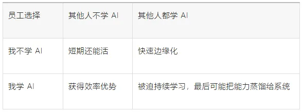 员工为了避免被 AI 替代,必须用 AI 提升自己;但提升自己的过程,又可能加速自己被系统替代。