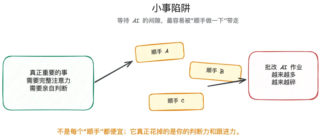 当你跟AI交流时,它处理任务需要等待。 而AI的并行能力非常强,你可以开无数个线程处理不同的事情。 在这个等待的过程中,我往往会想: “哎,顺便把这件小事也处理一下吧。”