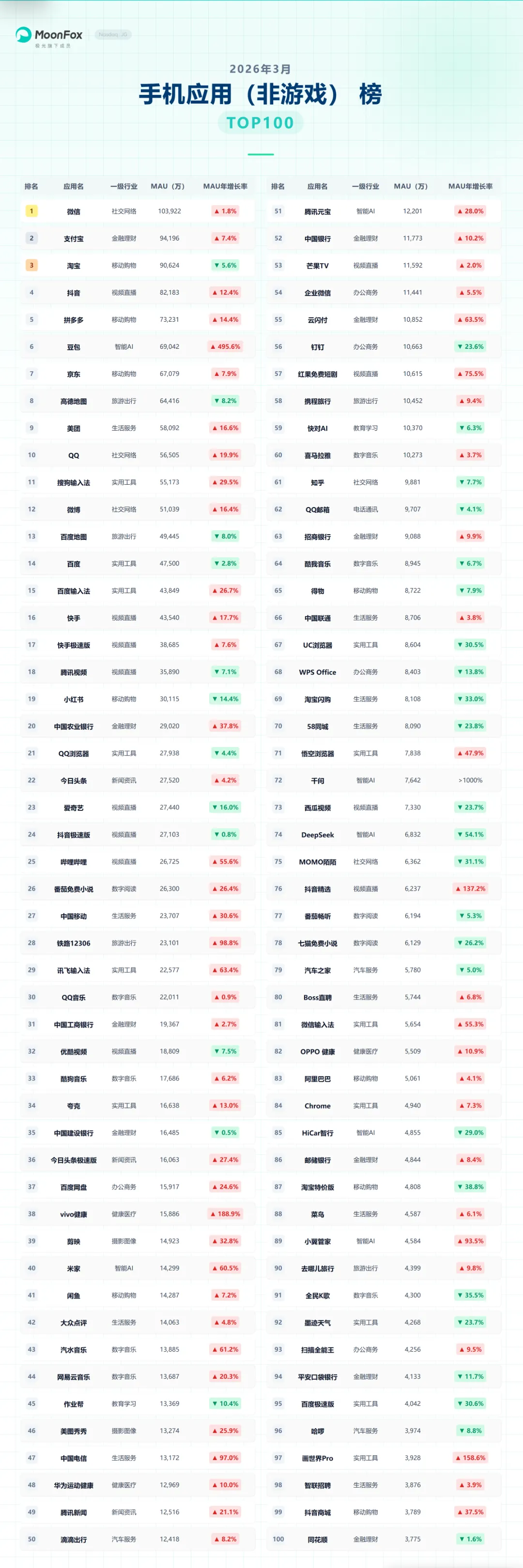 (以下为2026年3月手机应用(非游戏)榜TOP 100完整数据,清晰呈现各APP用户规模及增长情况,供大家参考)