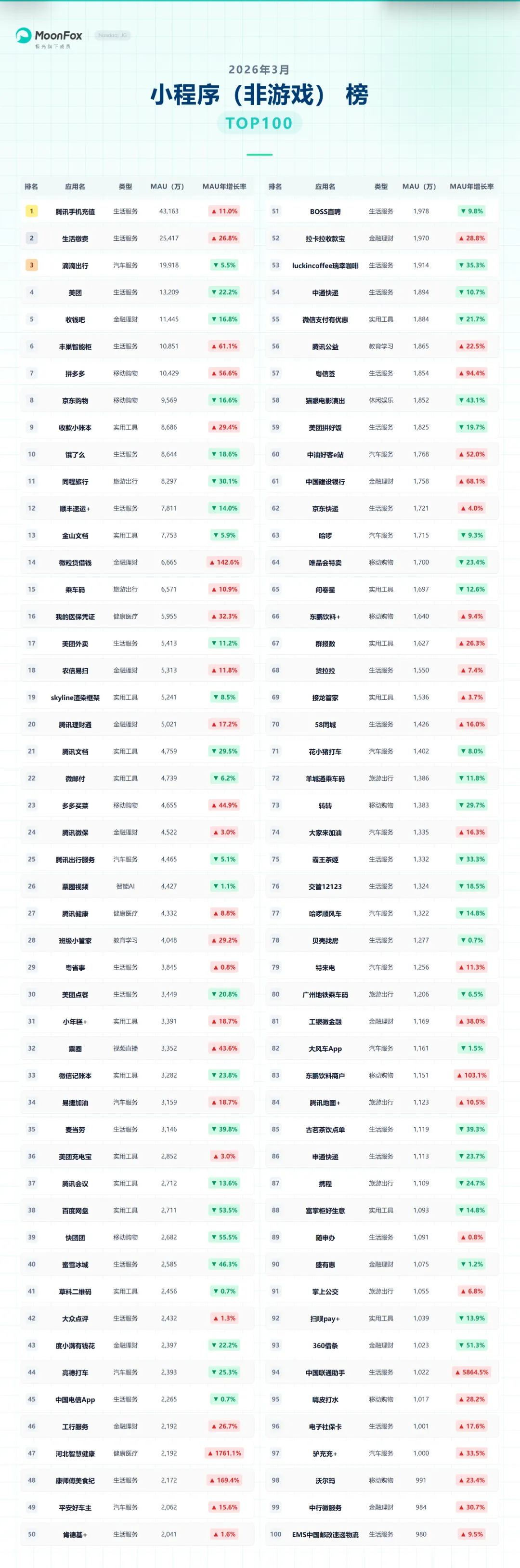 (以下为2026年3月小程序(非游戏)榜TOP100完整数据,全面呈现小程序行业格局,供大家参考)