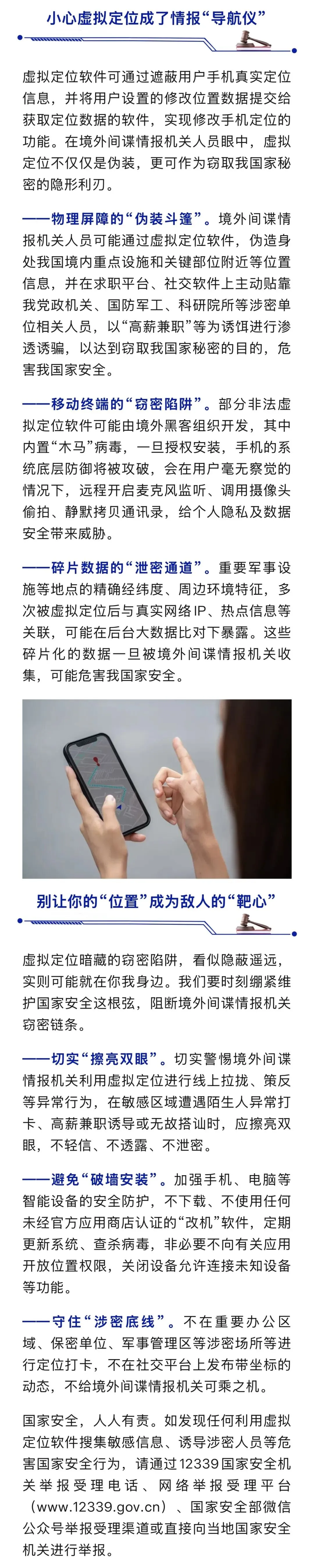 虚拟定位软件可能被境外间谍情报机关利用,重要军事设施等地点的精确经纬度、周边环境特征,可能在后台大数据比对下暴露,国安部曝光