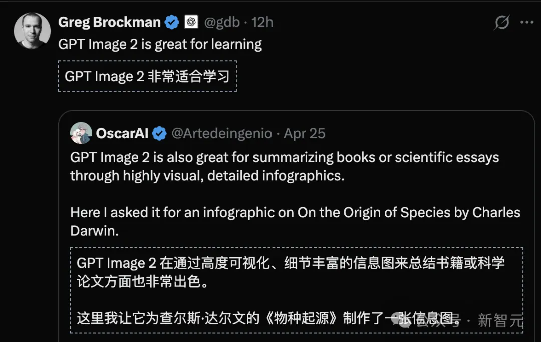 OpenAI联合创始人、总裁Greg Brockman转发用户展示,力荐GPT Image 2将《物种起源》等书籍瞬间转为详细信息图,促进高效学习。