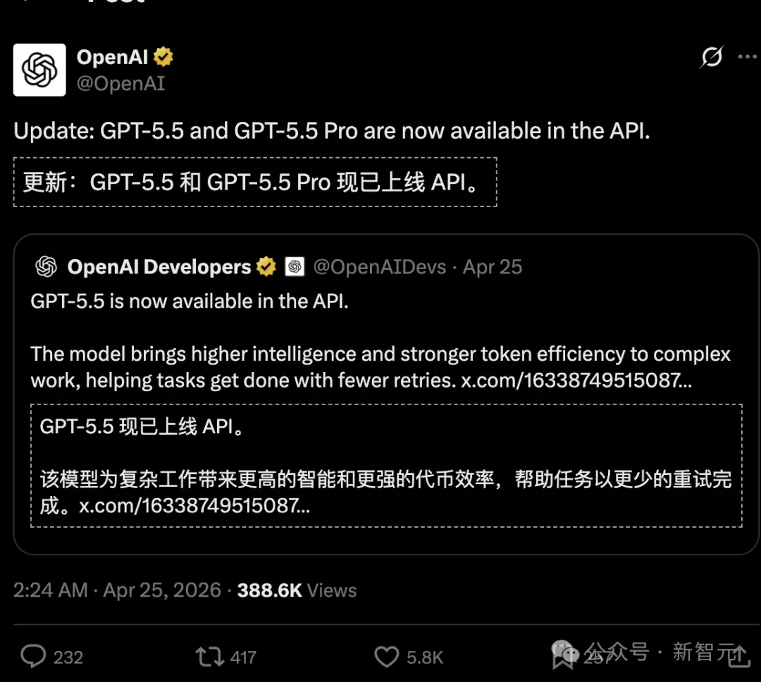 昨天,OpenAI API新品登场:GPT-5.5及Pro版现已可用,显著提升智能水平和token效率,完美适配复杂任务场景,如编码、分析等高负载应用。