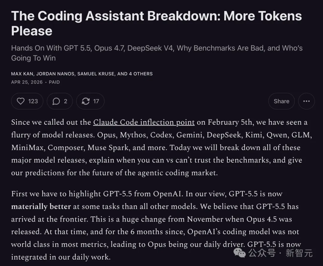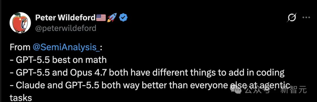 测试之后,AI行业分析机构SemiAnalysis坦承:在某些任务上的表现,GPT-5.5已经显著超越了所有其他模型。
