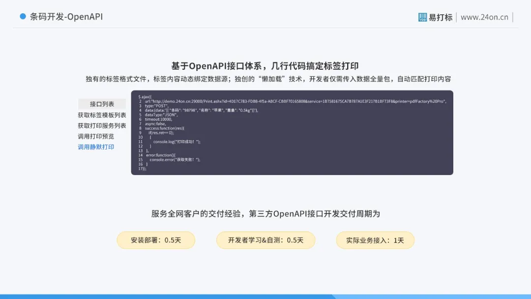 标签对接 ERP,实现业务数据互通易打标支持标签对接用友、金蝶、浪潮等主流 ERP、MES、WMS 管理系统,通过 OpenAPI 开放接口实现标签模板与企业业务数据联动,可完成一物一码自动生成、批量打印等操作,提升仓储、供应链环节的管理效率。