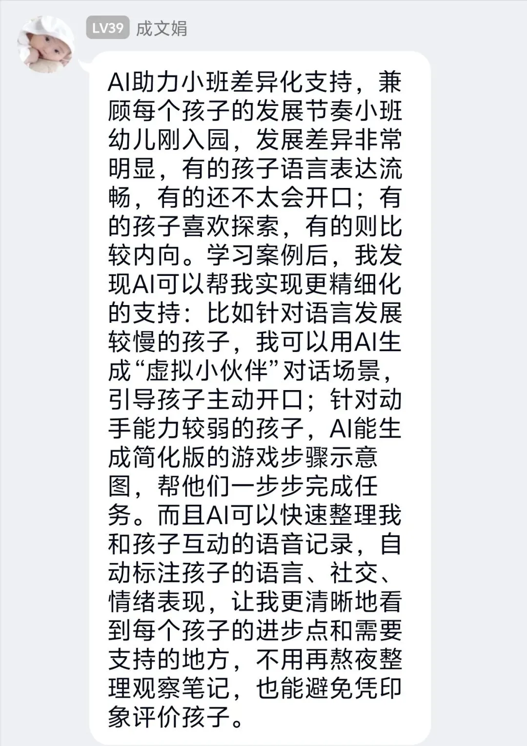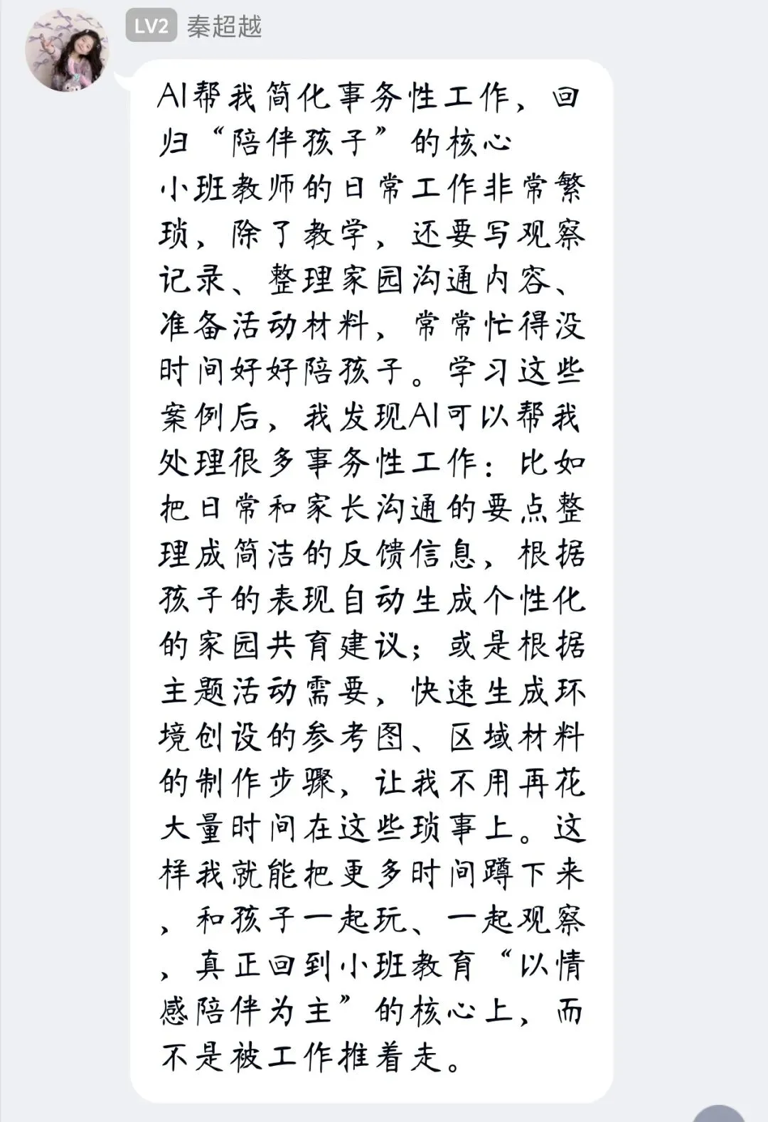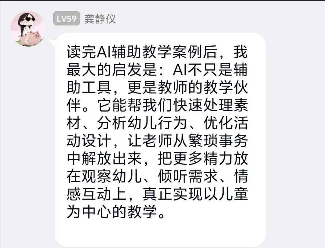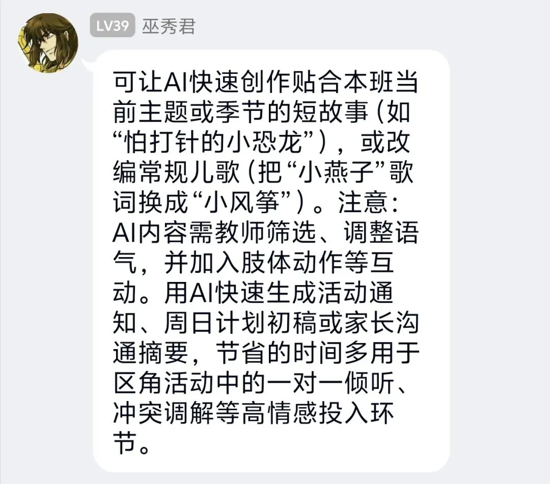 结合班级实际,我计划将AI运用到区域活动与观察记录环节。比如用AI生成美工区、建构区的分层指导建议,快速整理幼儿游戏中的语言与行为亮点,形成个性化观察分析,让活动组织更有针对性,更好地支持幼儿深度学习。