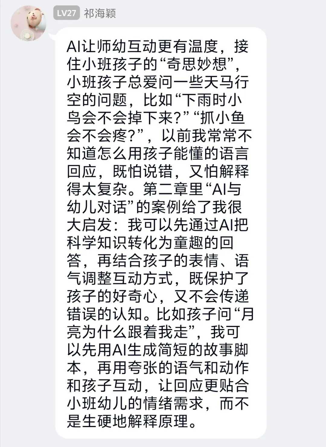 章节中丰富的AI辅助教学实践案例,为日常幼教工作打开了全新视角。学习本章内容后,这些案例给你带来了哪些教学新启发与新思路?