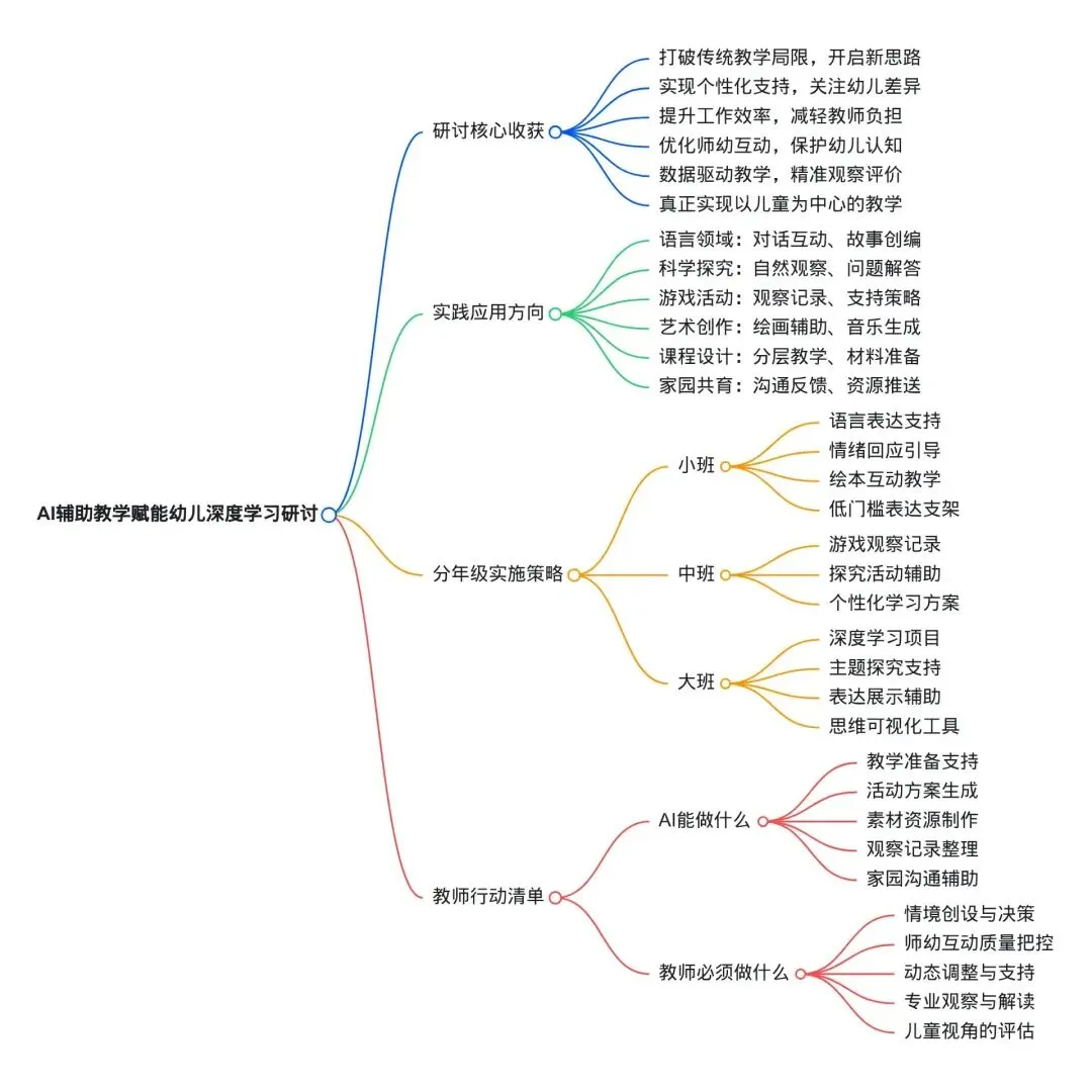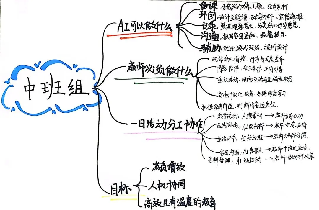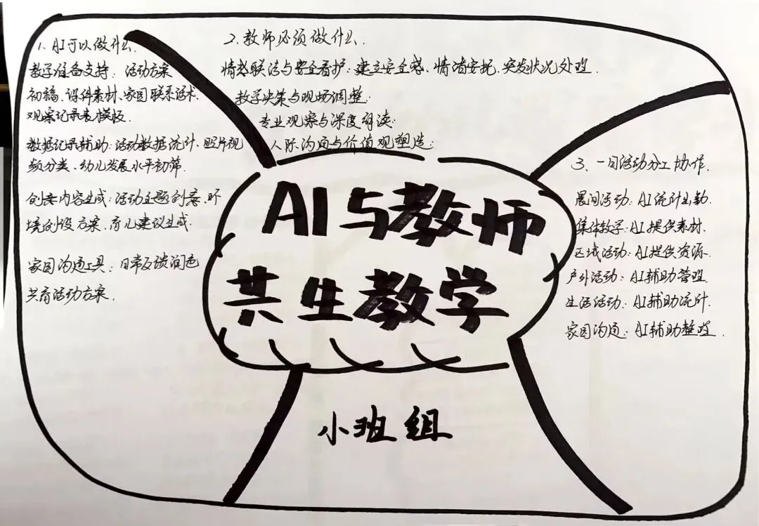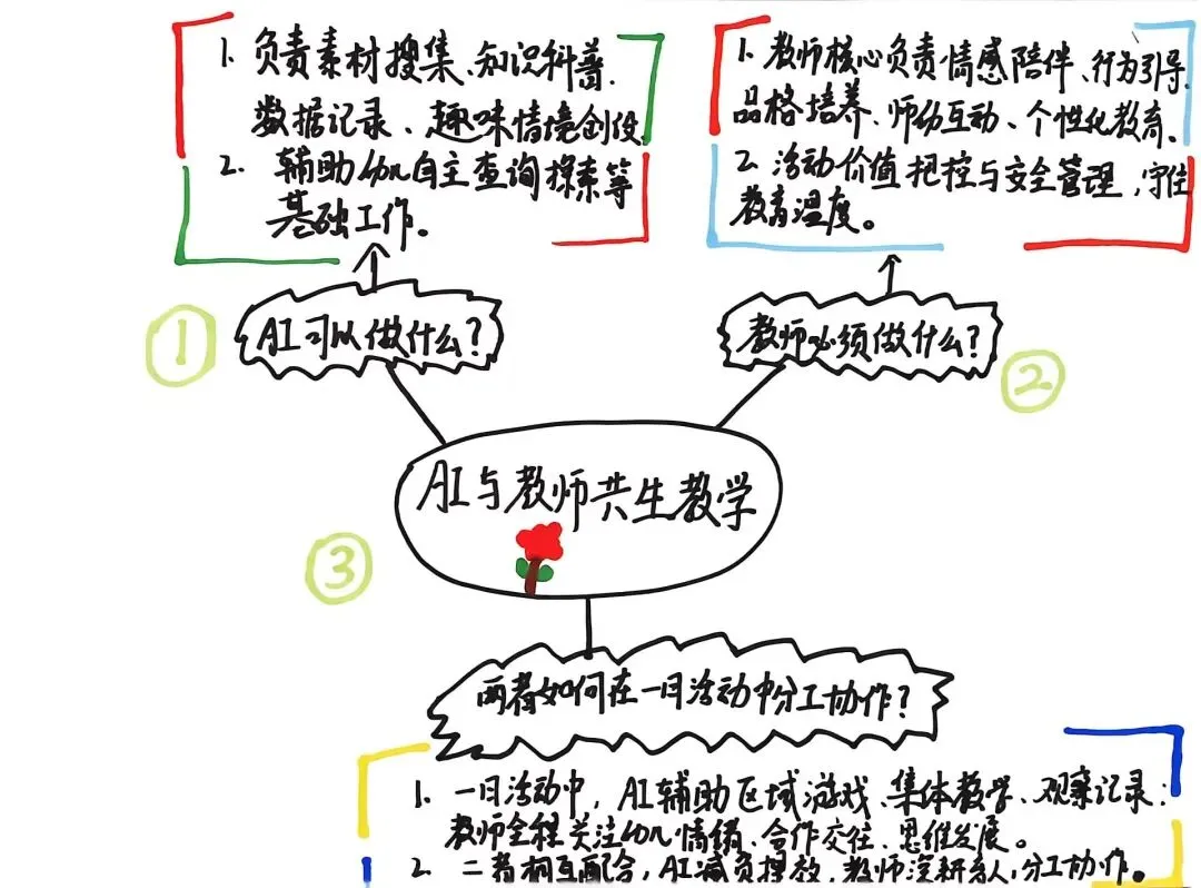 以年级组为单位,围绕“教师与AI共生”理念,共同绘制思维共享图。厘清AI与教师的教学分工、协作边界,梳理一日活动中二者高效配合的实践思路。
