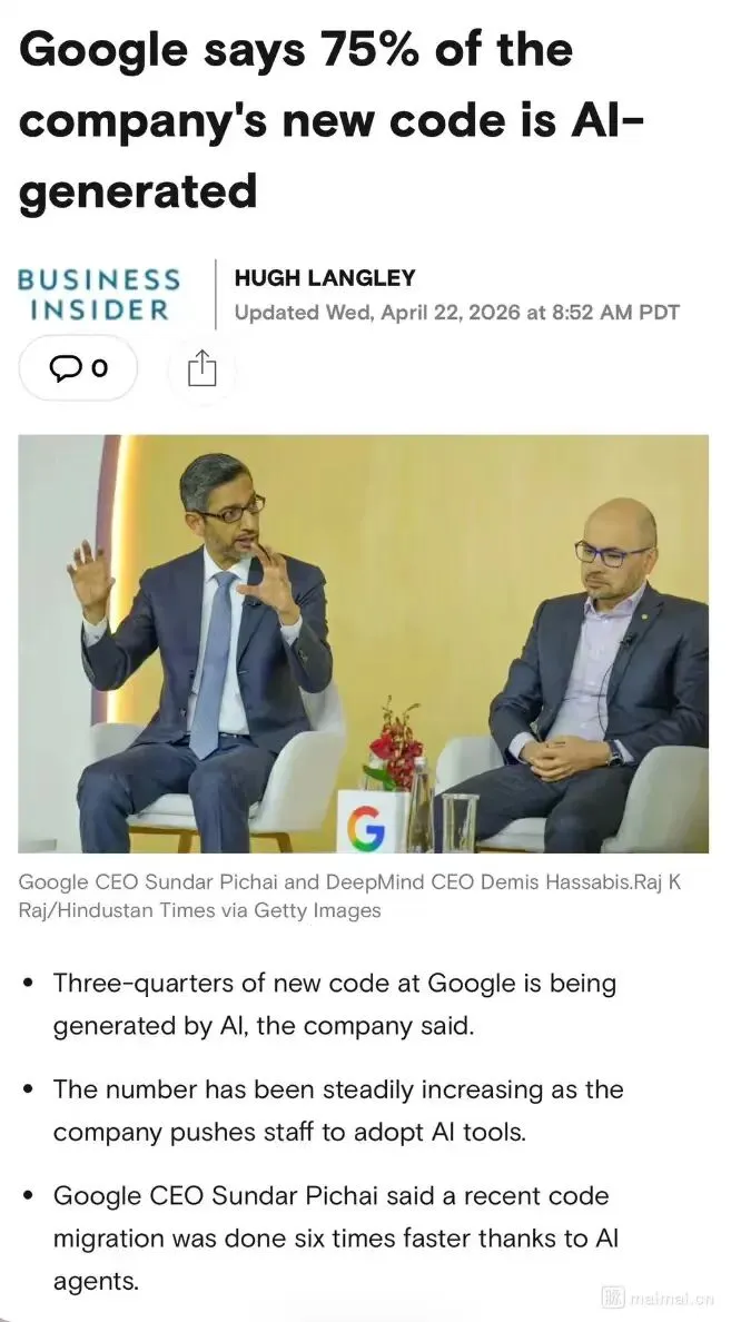 “谷歌 CEO 皮查伊宣布:公司内部新编写的代码,75% 由 AI 生成,然后再交给人类工程师审核。”